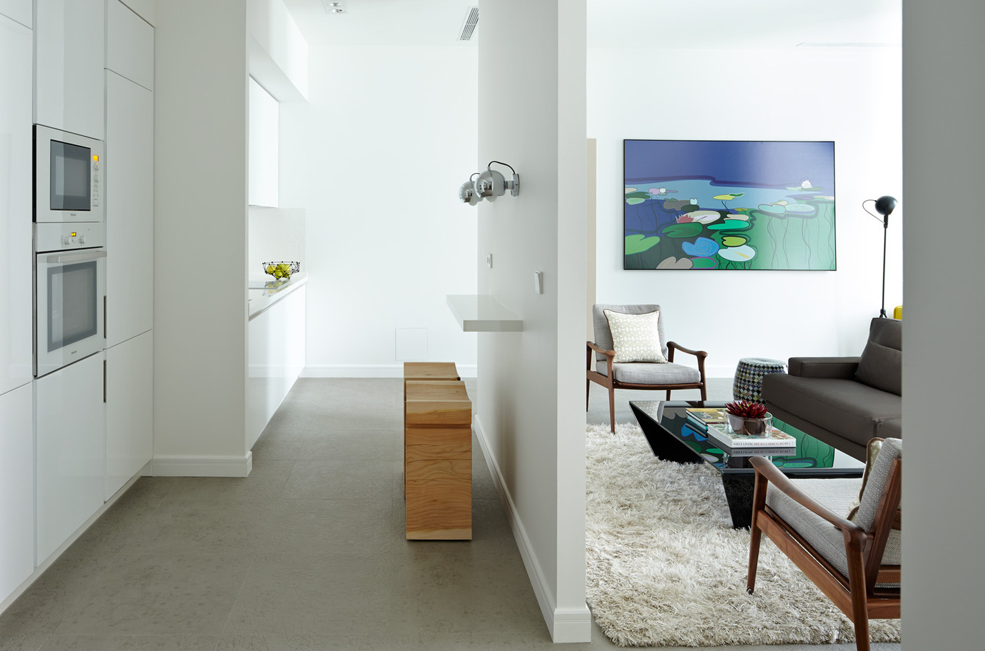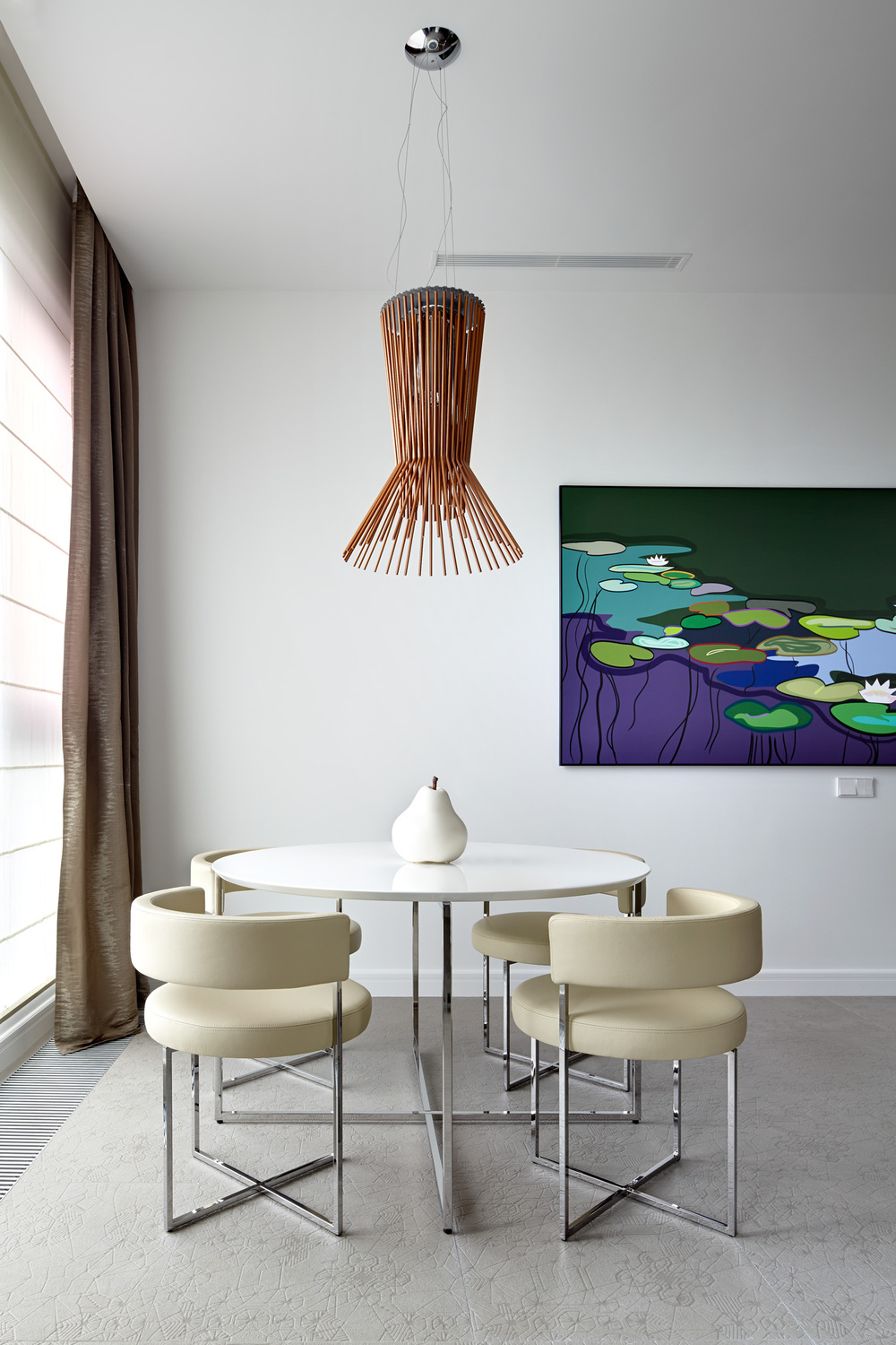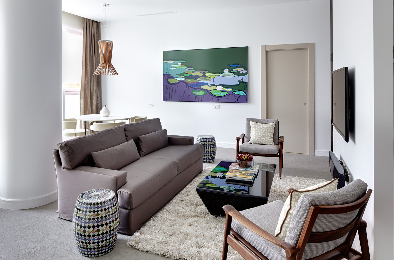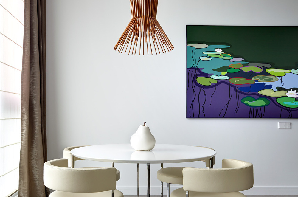 Выдержанный интерьер в эклектичном стиле, с функциональным зонированием помещений подходит для жизни в большом мегаполисе. Мы предпочли белый цвет, травянистые оттенки, натуральные материалы в отделке, массив дуба и мозаику. Гостиная за счет несущей колонны визуально поделена на три части - столовую, зону отдыха с кушеткой у окна и уютное место у телевизора, за которой размещена кухня с небольшим белым столиком для завтраков. Текстильное изголовье, фактурные ткани и пушистый ковер добавляют в интерьер уюта и тепла. Современные арт работы в гостиной объединяют все в единую цветовую палитру, а панорамные окна с видом на город наполняют пространство ритмом и светом.