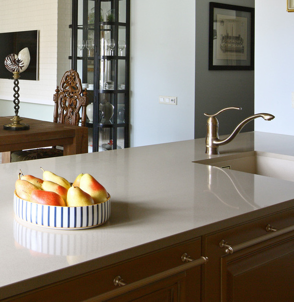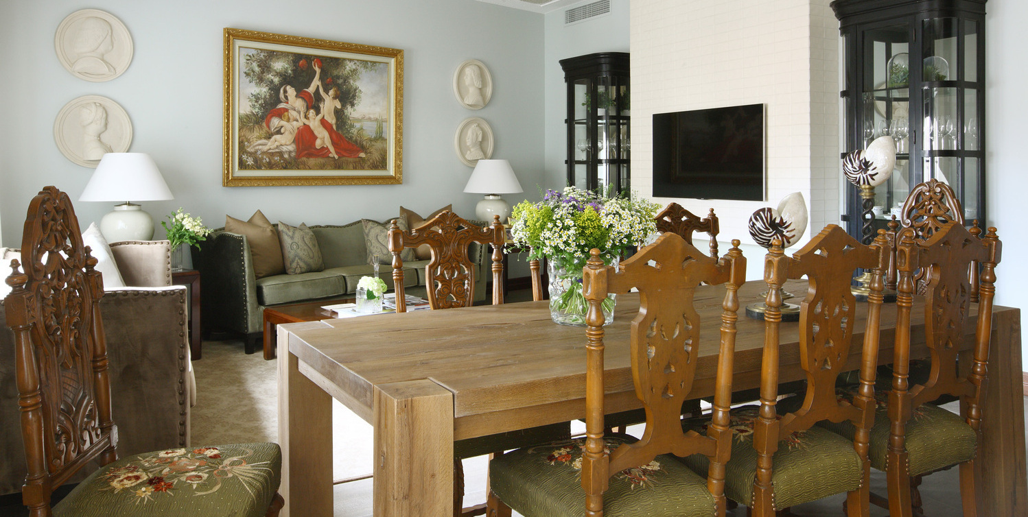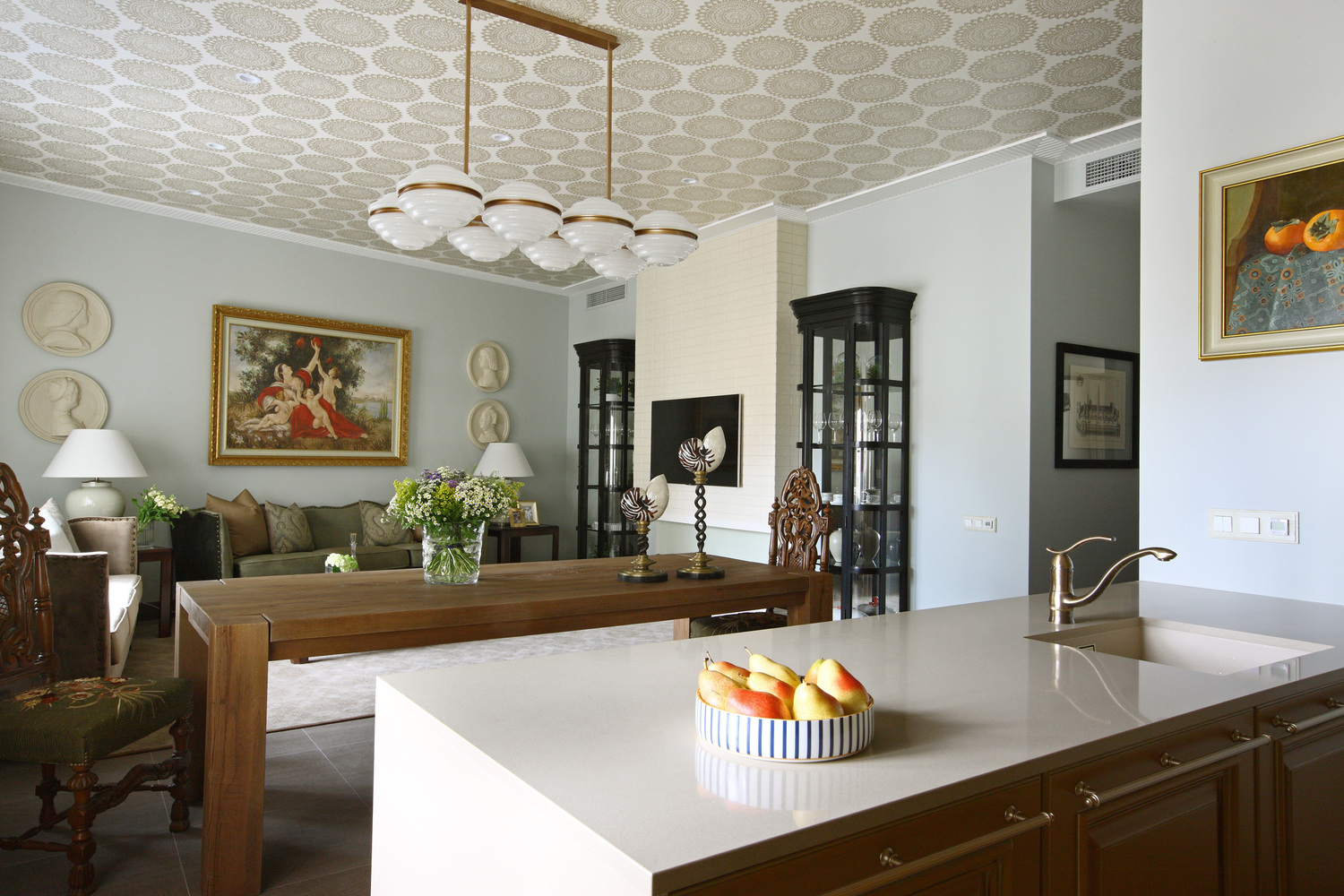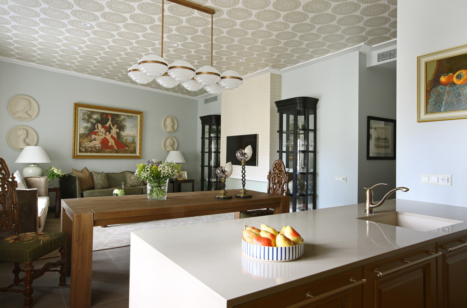 Роскошный современный классический стиль этой квартиры отражает традиционные ценности ее хозяев, а также прекрасно дополняют архитектуру дома. В этом интерьере мы смешали антикварные предметы с новыми и создали уютную атмосферу загородного дома. Мы использовали в прихожей и кухне керамогранит под натуральный травертин, а в комнатах прочную инженерную доску в цвете орех. Двери из массива ореха имеют фрамугу, что делает их силуэт более вытянутым. Для потолка мы предложили интересное решение - обои, по периметру их обрамляет широкий гипсовый молдинг. В гостиной стена за телевизором является декоративной, она помогает зонировать пространство и имитирует дымоход для биокамина.