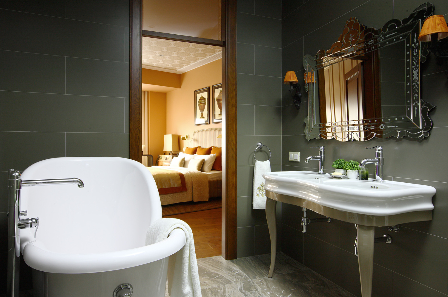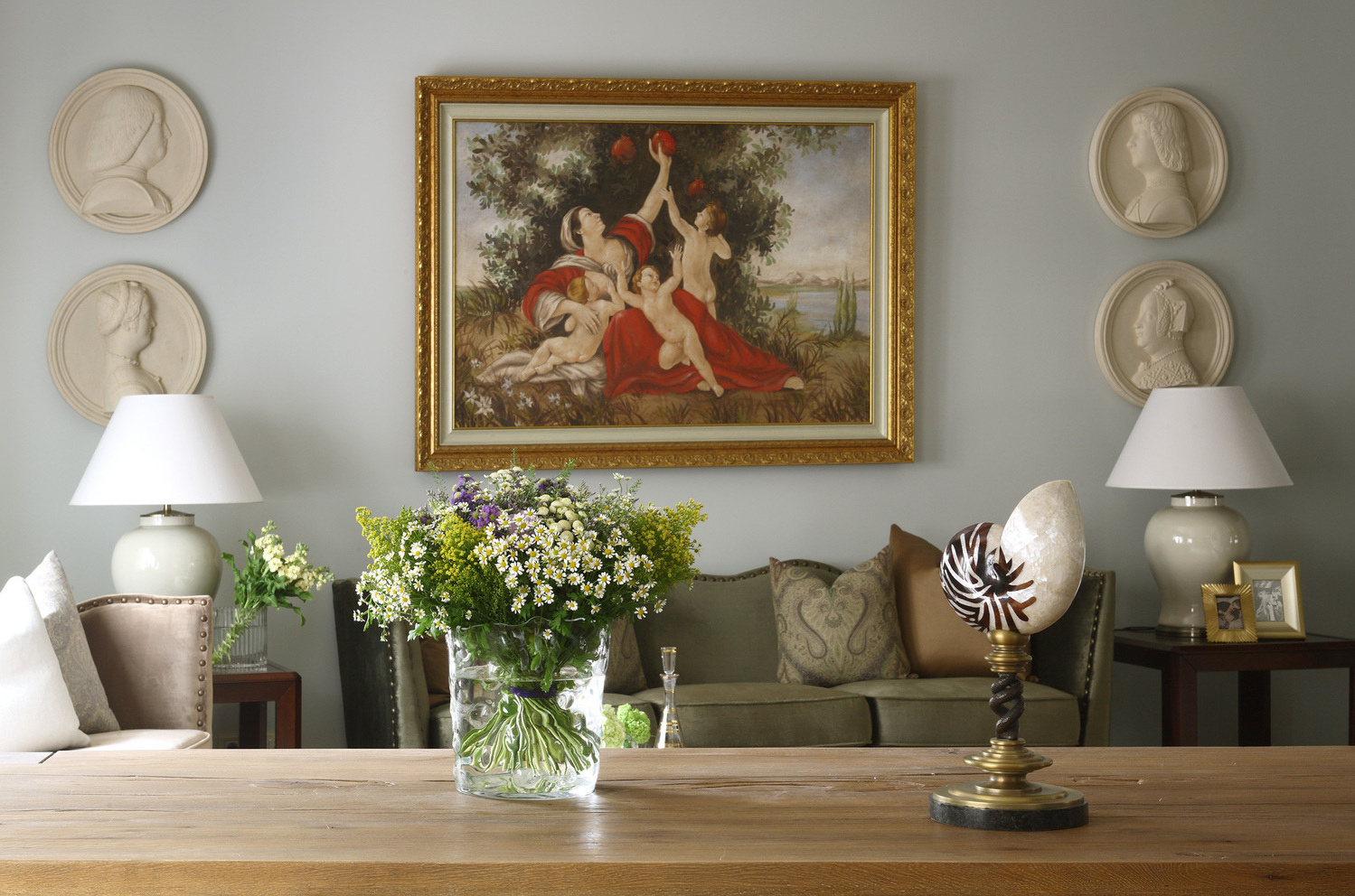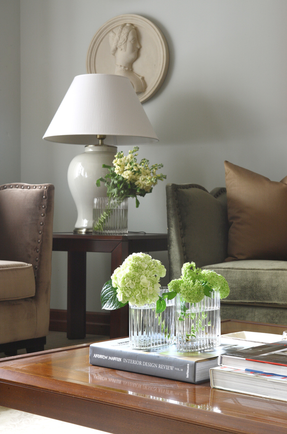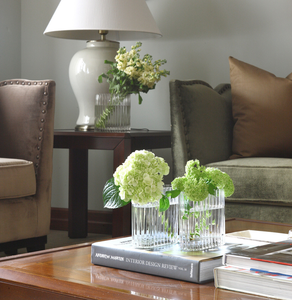 Роскошный современный классический стиль этой квартиры отражает традиционные ценности ее хозяев, а также прекрасно дополняют архитектуру дома. В этом интерьере мы смешали антикварные предметы с новыми и создали уютную атмосферу загородного дома. Мы использовали в прихожей и кухне керамогранит под натуральный травертин, а в комнатах прочную инженерную доску в цвете орех. Двери из массива ореха имеют фрамугу, что делает их силуэт более вытянутым. Для потолка мы предложили интересное решение - обои, по периметру их обрамляет широкий гипсовый молдинг. В гостиной стена за телевизором является декоративной, она помогает зонировать пространство и имитирует дымоход для биокамина.