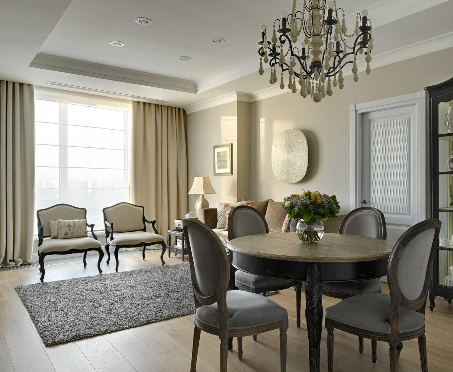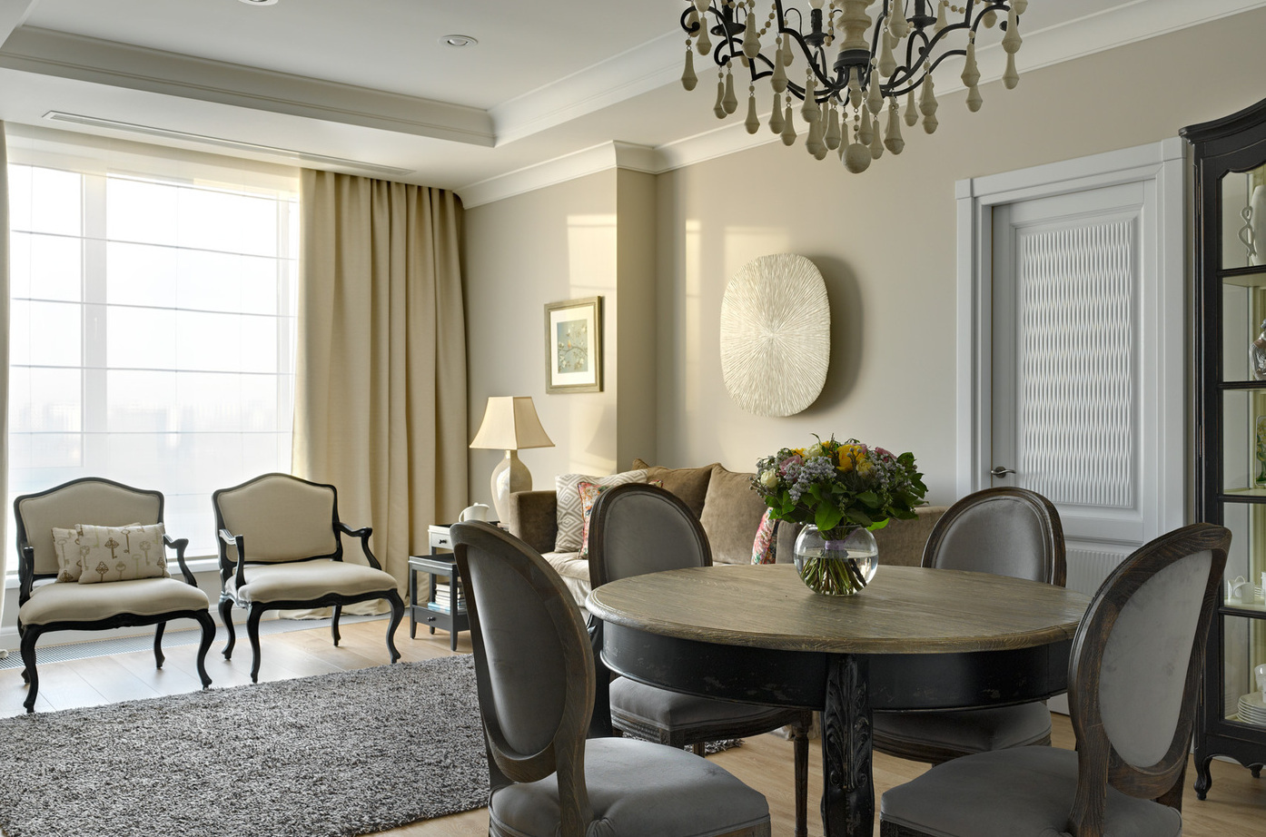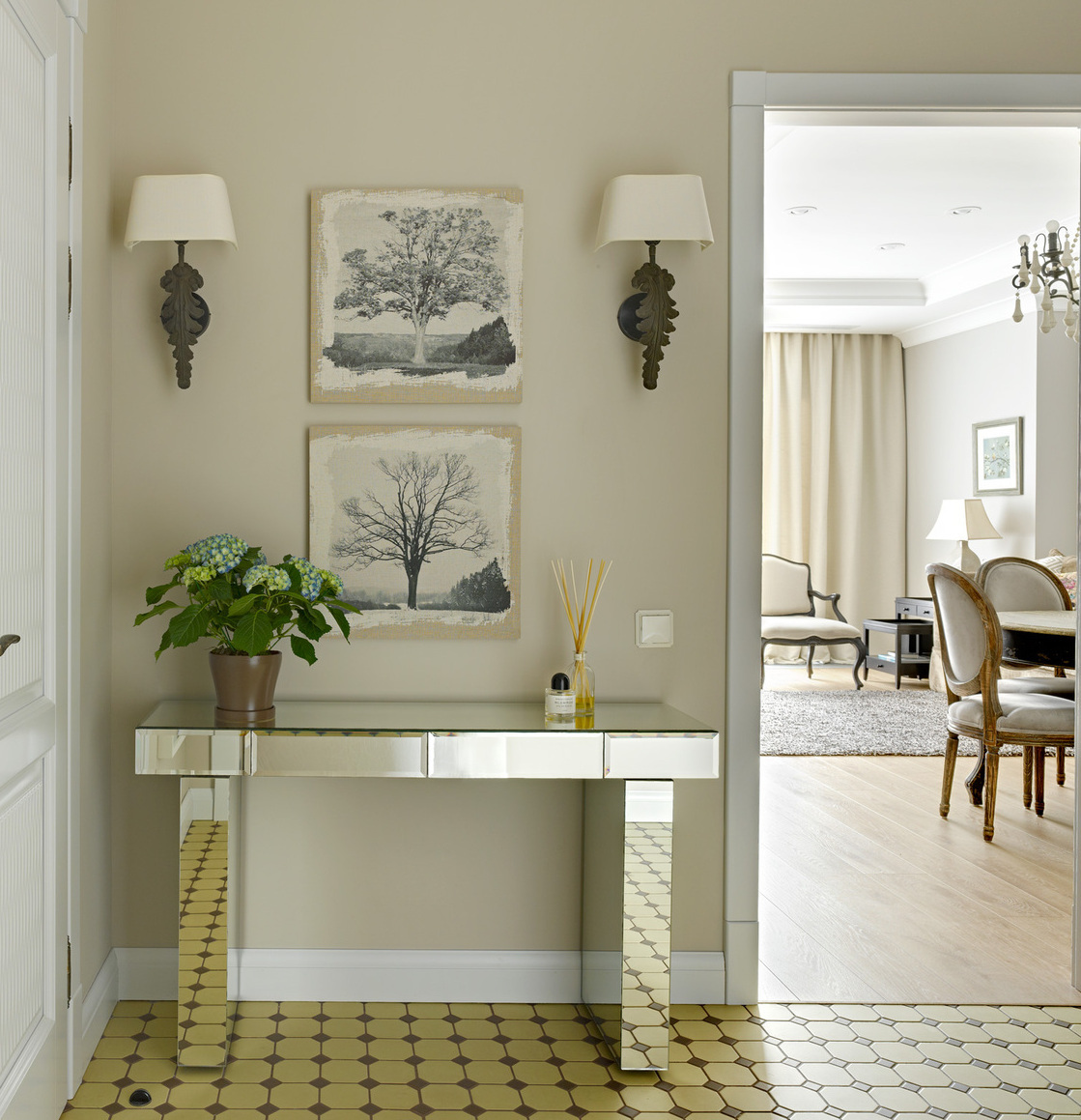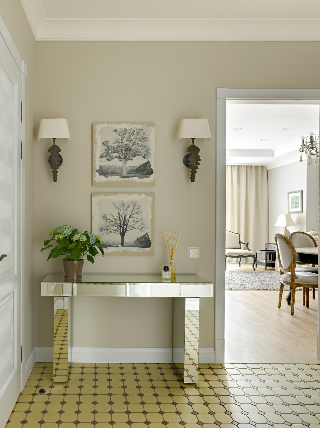 Квартира в стиле современной классики с ноткой французского гламура. Хозяйка - любительница бежево-серых цветов, натурального дерева и кошек. Как во всех наших интерьерах, мы делаем главный акцент на правильном практичном планировочном решении. И далее уже декорирование дополнительно подчеркивает достоинства квартиры. Простые современные формы в контрасте с классическими подчеркивают современную стилевую направленность пространства. Хрусталь, бархатная обивка мягкой мебели, зеркала, графические рисунки на плитке, нежные обои в спальне, благородные цвета дерева создают французский шик.