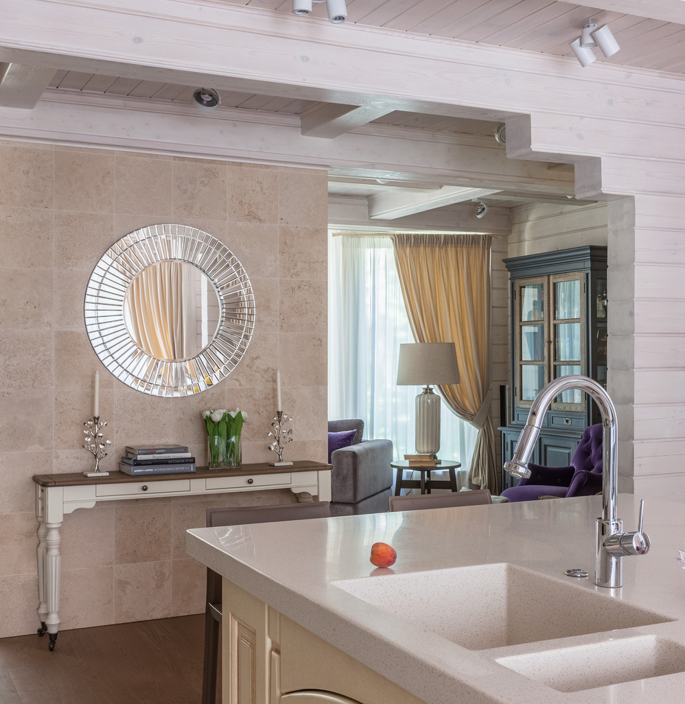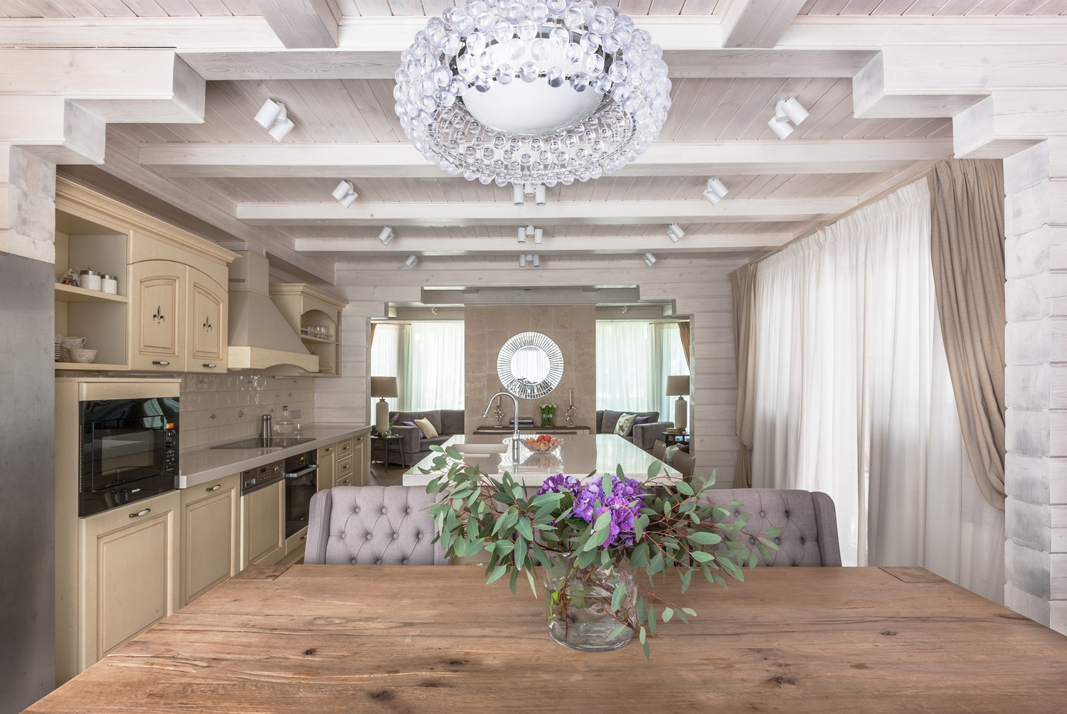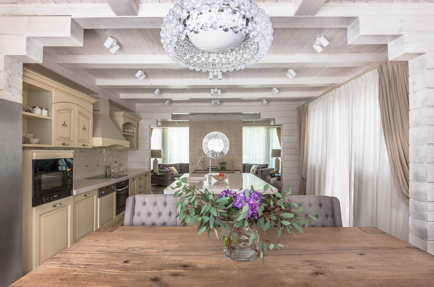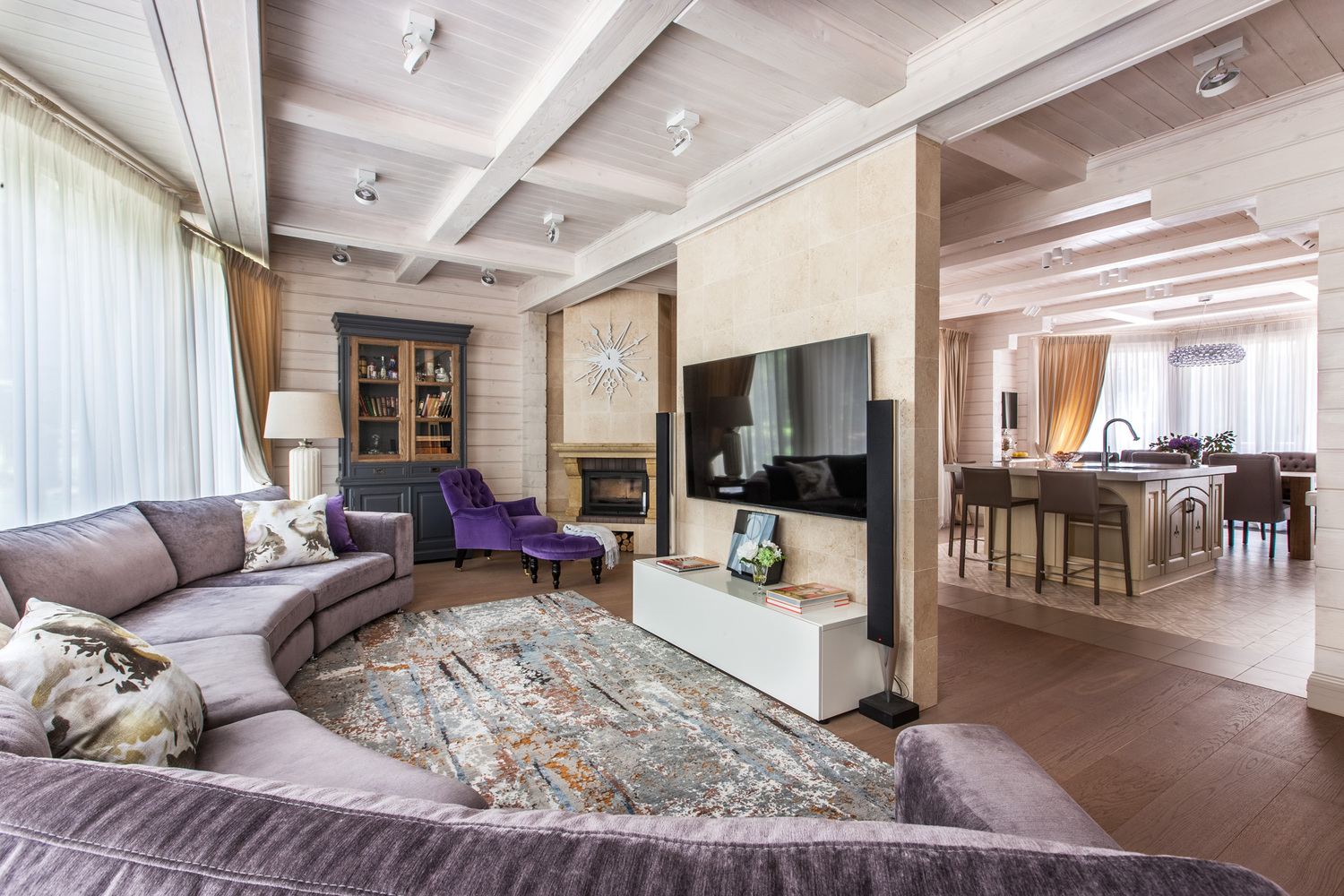 Атмосферный вневременной стиль этого дома из клееного бруса в Подмосковье был создан для молодой семьи. Перед нами стояла задача использовать весь потенциал существующего дома для новых хозяев, превращая его в оазис гостеприимства, спокойствия и элегантности. Мы приглушили яркий натуральный цвет бруса, осветлив общий тон, при этом мы не перекрыли естественный рисунок дерева. По цветам интерьера мы ориентировались на песчаные оттенки прибрежной природы, использовали травертин в отделке стен, выбирали натуральные оттенки деревянных покрытий, сочетали мягкие велюровые и льняные ткани.