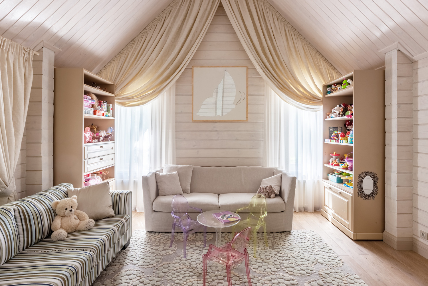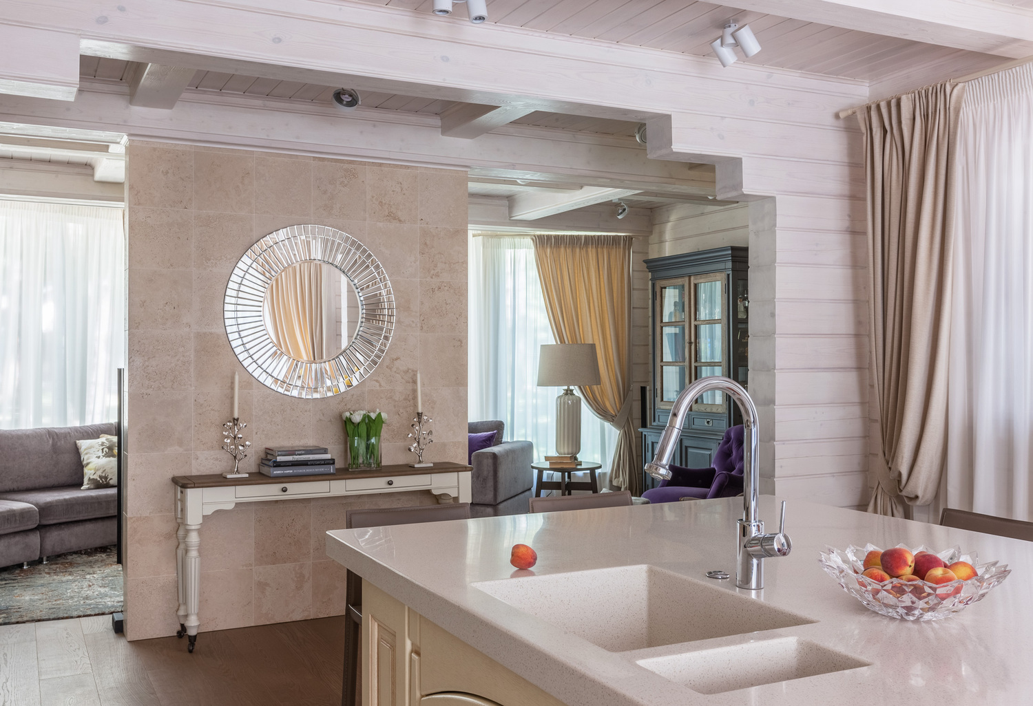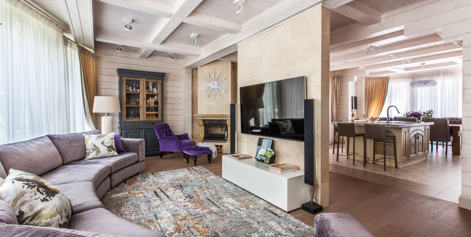 Атмосферный вневременной стиль этого дома из клееного бруса в Подмосковье был создан для молодой семьи. Перед нами стояла задача использовать весь потенциал существующего дома для новых хозяев, превращая его в оазис гостеприимства, спокойствия и элегантности. Мы приглушили яркий натуральный цвет бруса, осветлив общий тон, при этом мы не перекрыли естественный рисунок дерева. По цветам интерьера мы ориентировались на песчаные оттенки прибрежной природы, использовали травертин в отделке стен, выбирали натуральные оттенки деревянных покрытий, сочетали мягкие велюровые и льняные ткани.