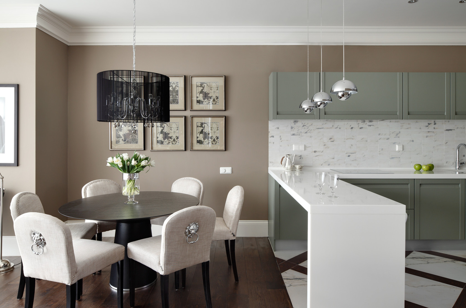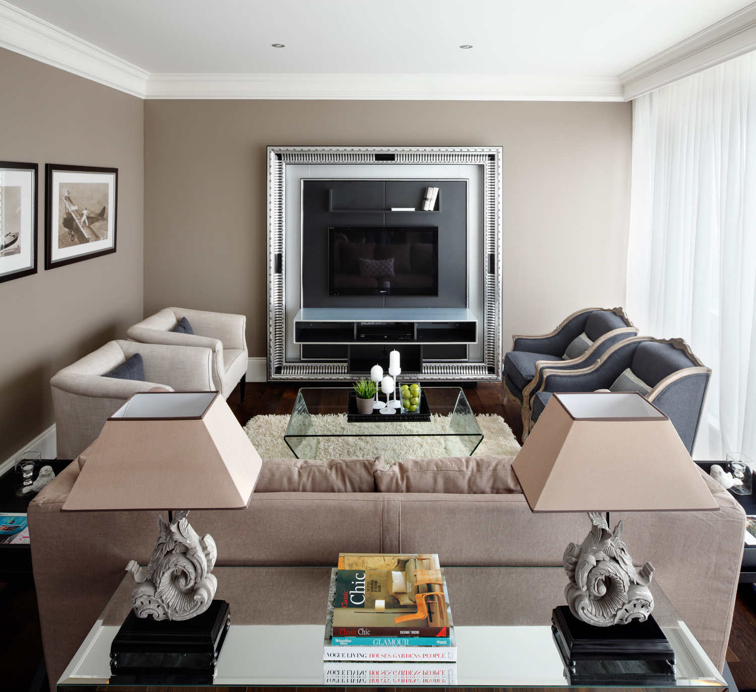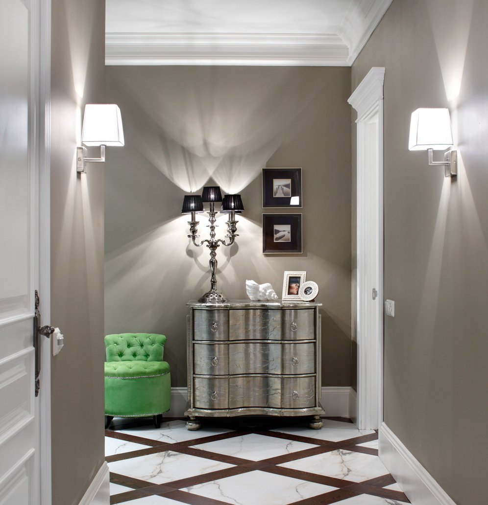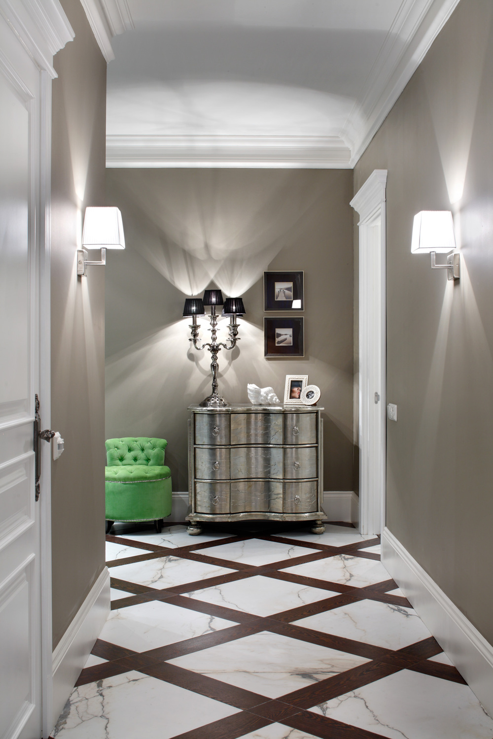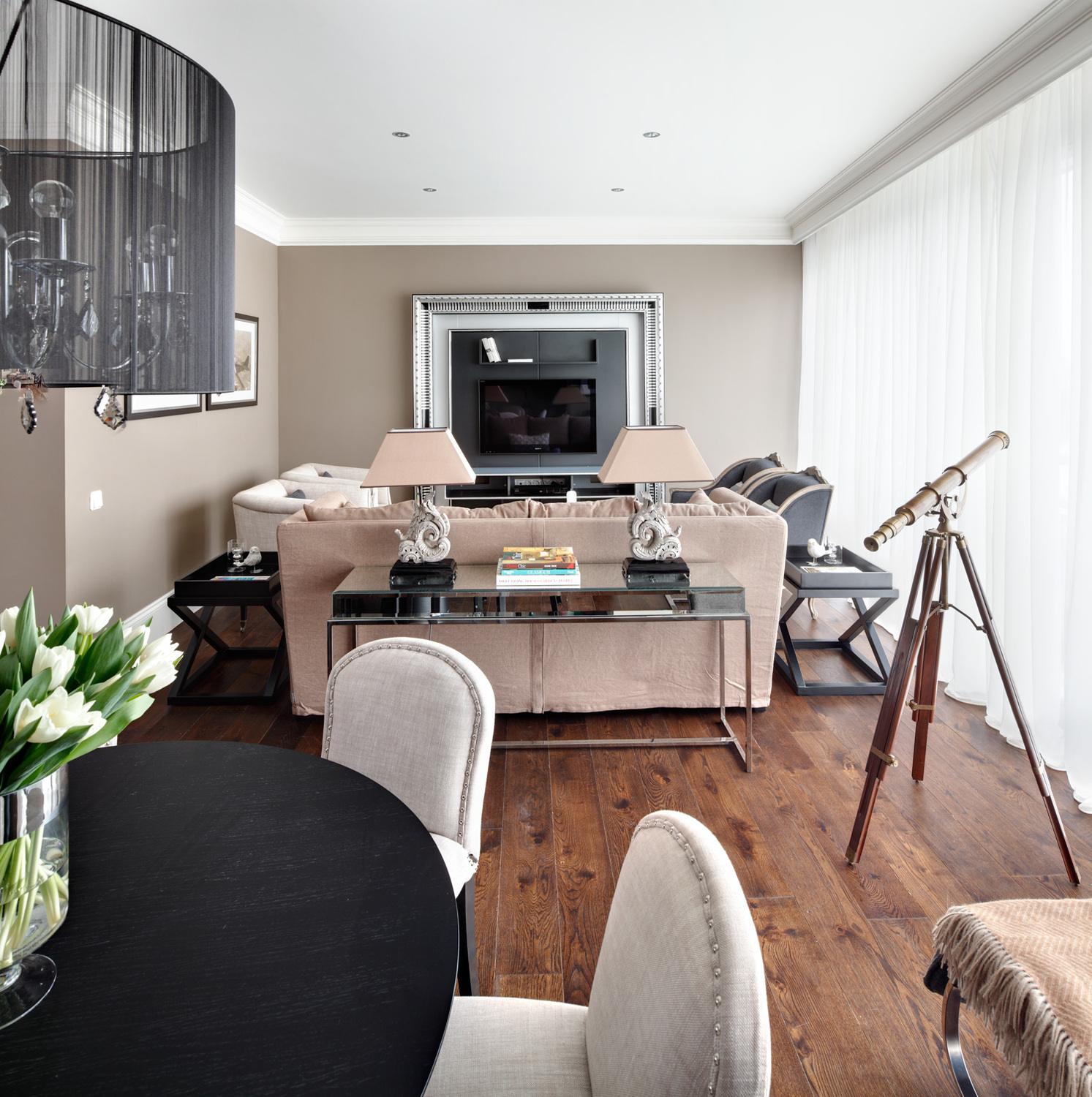 Квартира имела удачную прямоугольную форму помещения с большим количеством окон в пол и французскими балконами с изумительными видами. Грамотная планировка с правильным сочетанием отделочных материалов, мебели и света, в результате которого получился стиль модной эклектики очень понравилась хозяевам. Натуральные цвета, молочно-кофейные тона, графический рисунок на плитке, дерево темного и черного цветов, строгая лепнина, кожа, хром и хрусталь привнесли в интерьер уют и тепло. Разноуровневый мягкий свет подчеркнул это. Тщательно подобранные арт объекты и аксессуары дополнили это наполненное воздухом и светом стильное пространство.