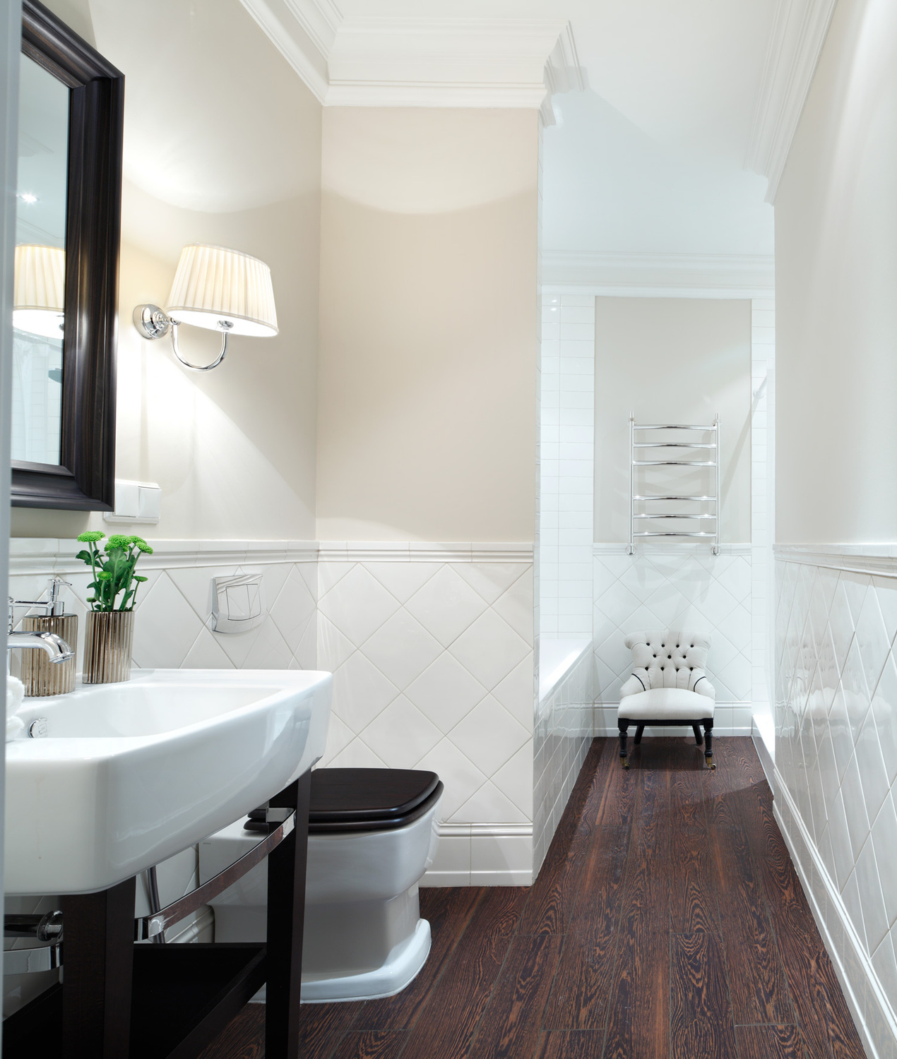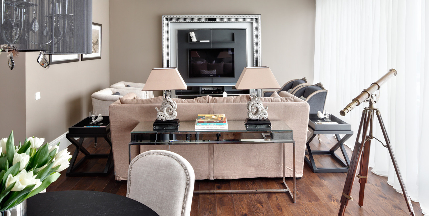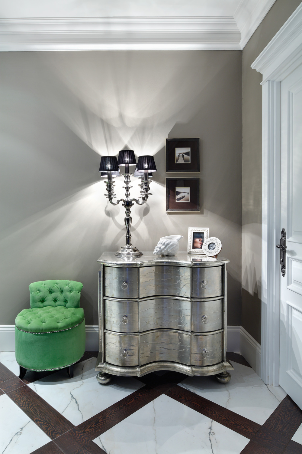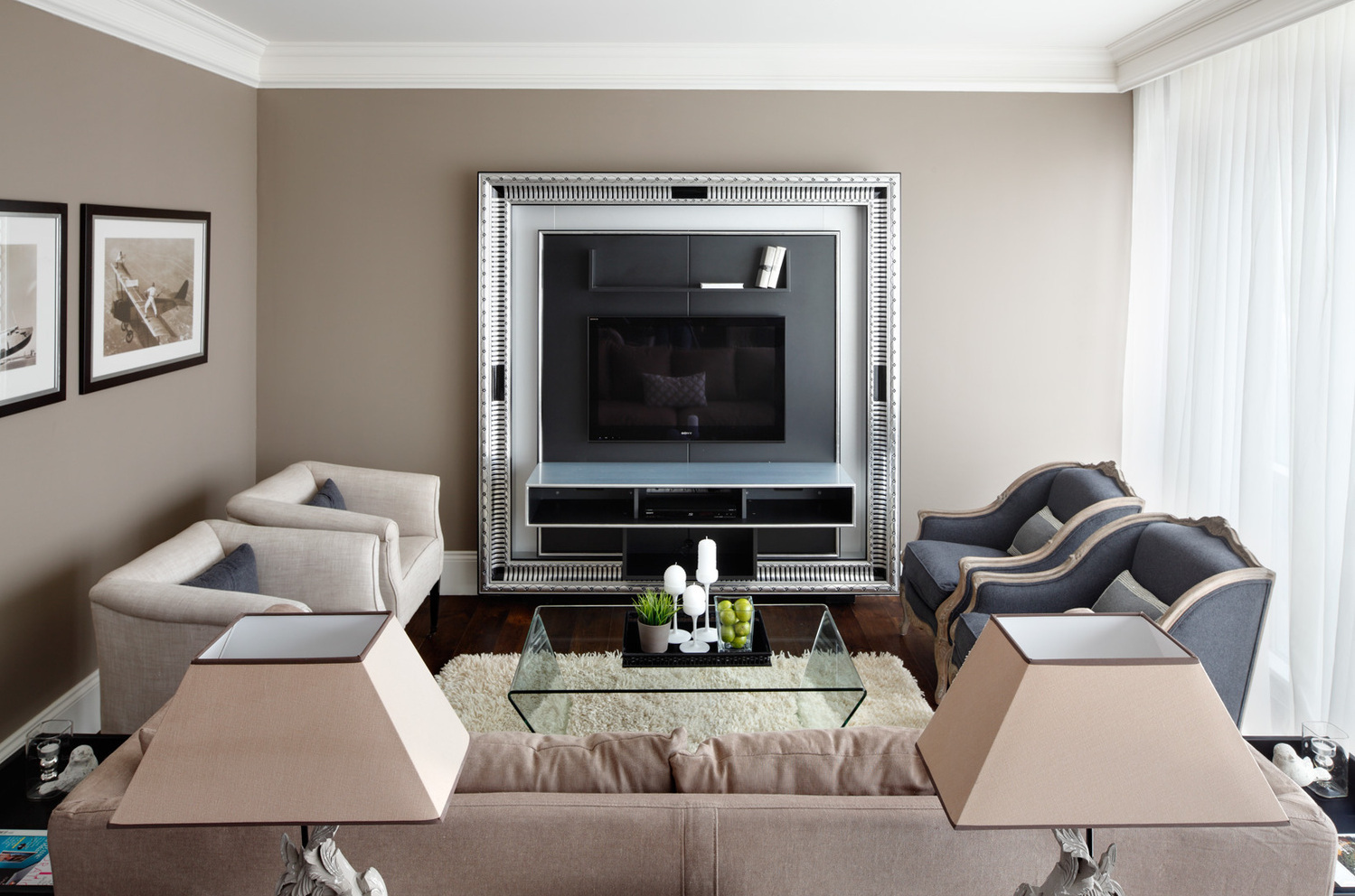 Квартира имела удачную прямоугольную форму помещения с большим количеством окон в пол и французскими балконами с изумительными видами. Грамотная планировка с правильным сочетанием отделочных материалов, мебели и света, в результате которого получился стиль модной эклектики очень понравилась хозяевам. Натуральные цвета, молочно-кофейные тона, графический рисунок на плитке, дерево темного и черного цветов, строгая лепнина, кожа, хром и хрусталь привнесли в интерьер уют и тепло. Разноуровневый мягкий свет подчеркнул это. Тщательно подобранные арт объекты и аксессуары дополнили это наполненное воздухом и светом стильное пространство.