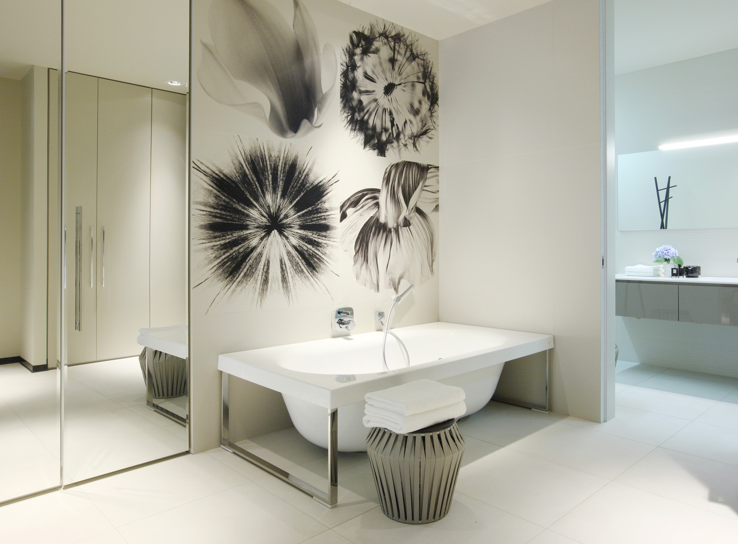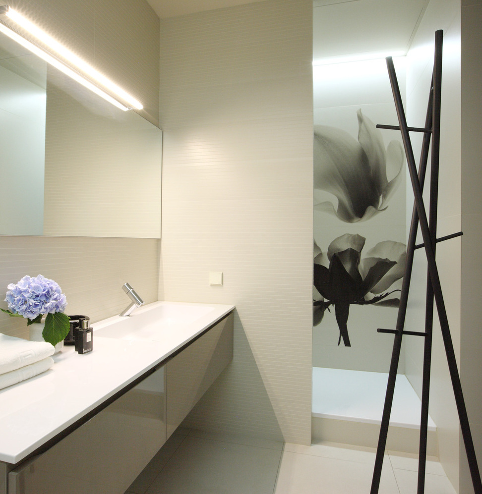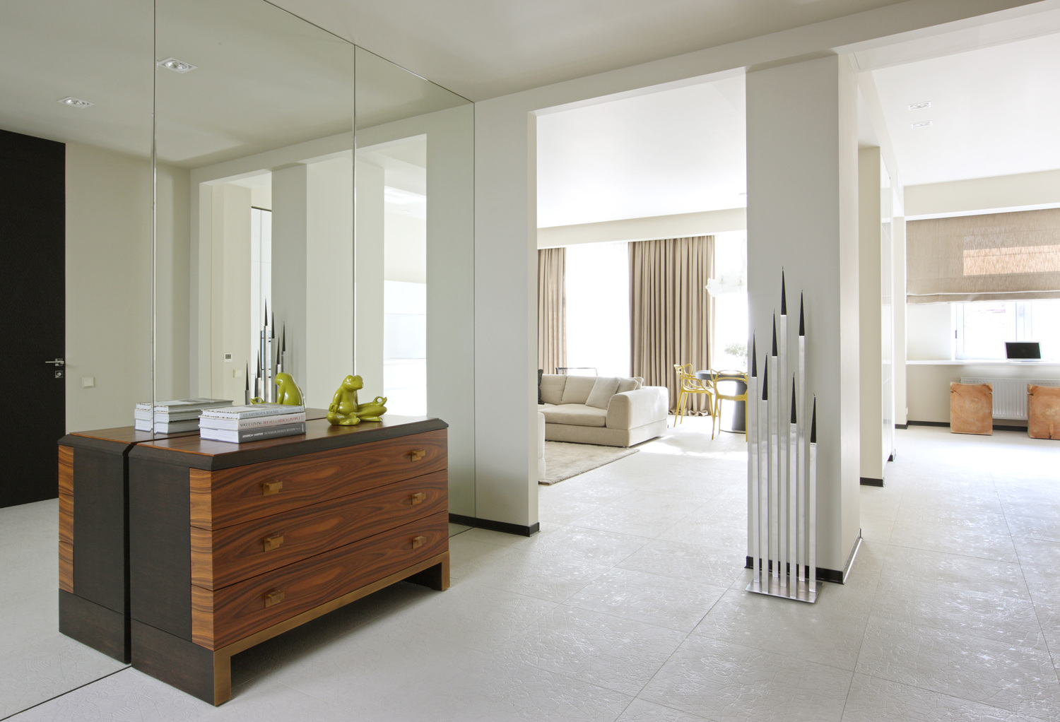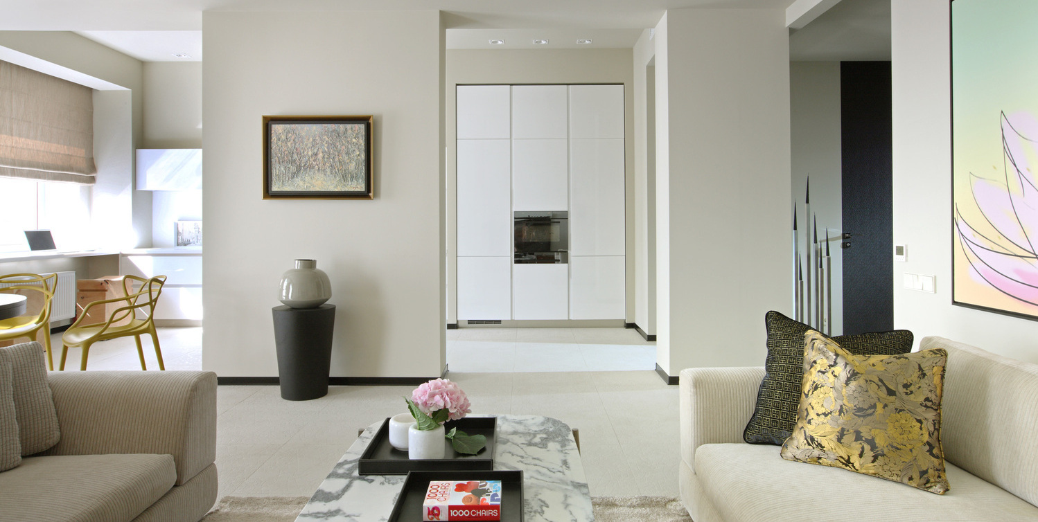 Лаконичная квартира в самом модной районе Москвы. Мы предложили единую концепцию для всей квартиры, сделали акценты на чистые архитектурные линии, культовые светильники и натуральные оттенки. Темные двери в потолок со скрытым коробом визуально увеличивают высоту потолка. Планировка квартиры проработана с особым вниманием. Большое количество встроенных шкафов спрятаны за зеркальными фасадами. В прихожую попадает естественный свет из гостиной и кухни. Самым неординарным и изысканным решением оказалась вынесенная в спальню ванна. На стенах за ванной использован тонкий керамогранит с печатью силуэтов цветов.