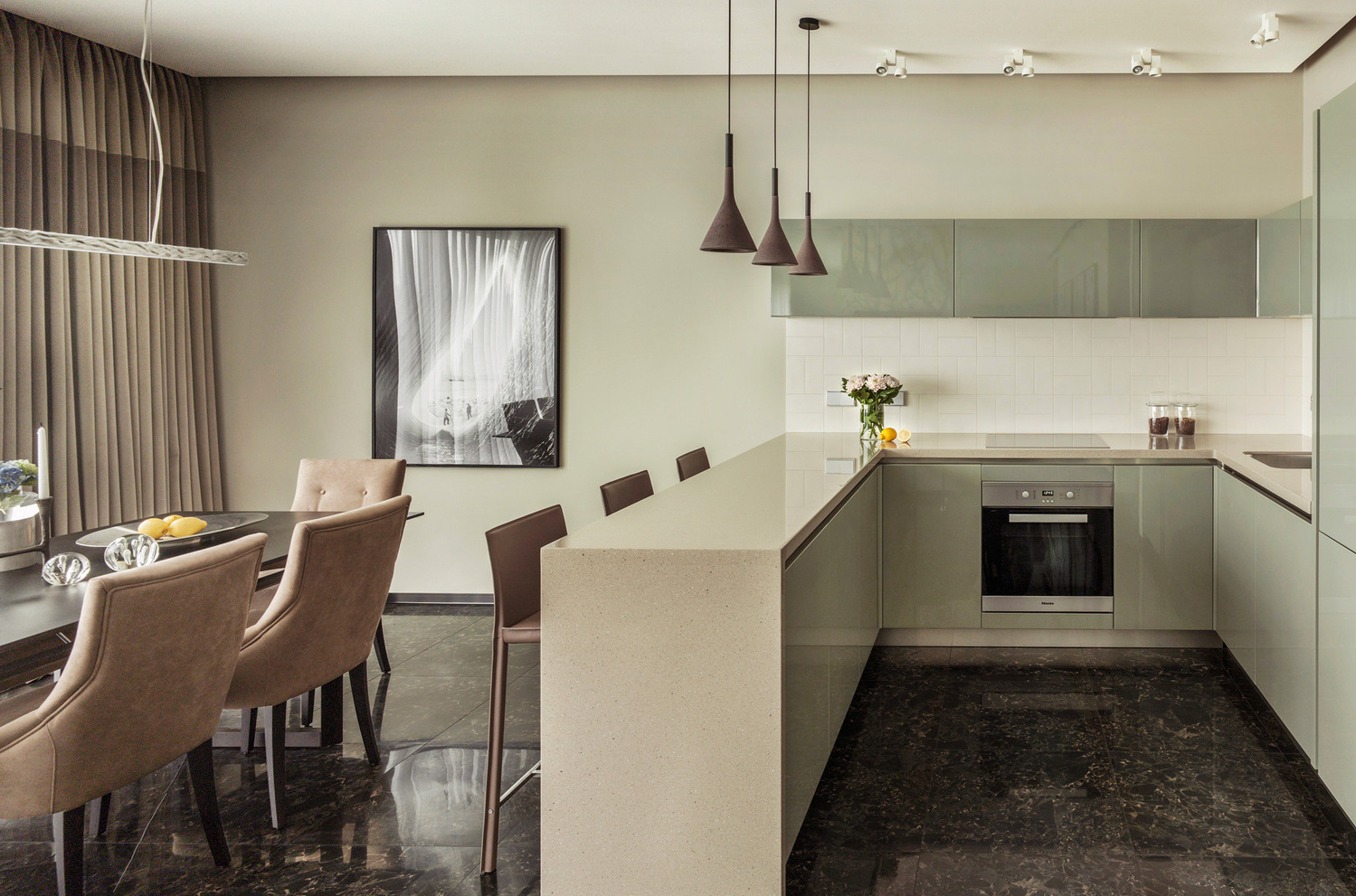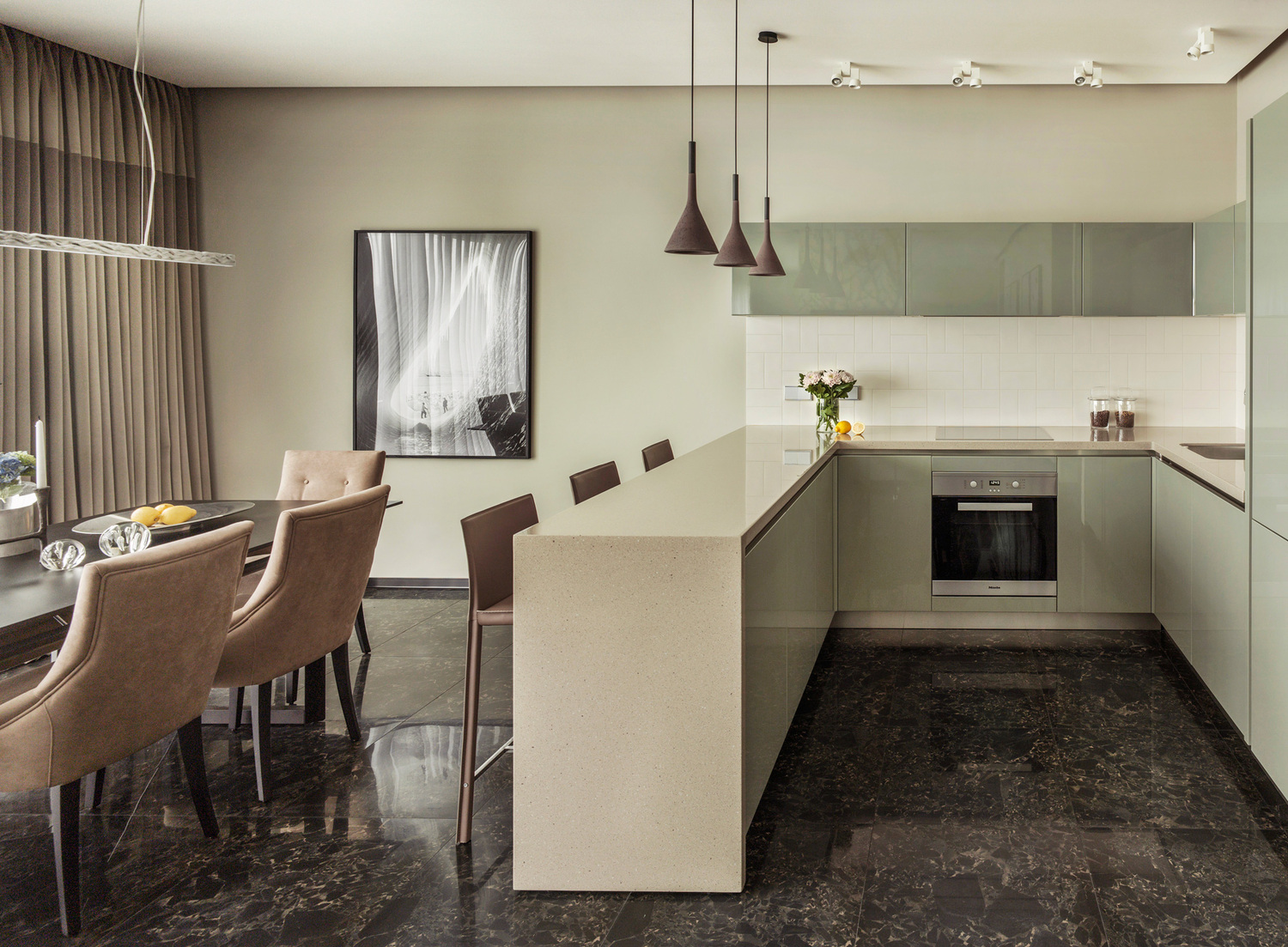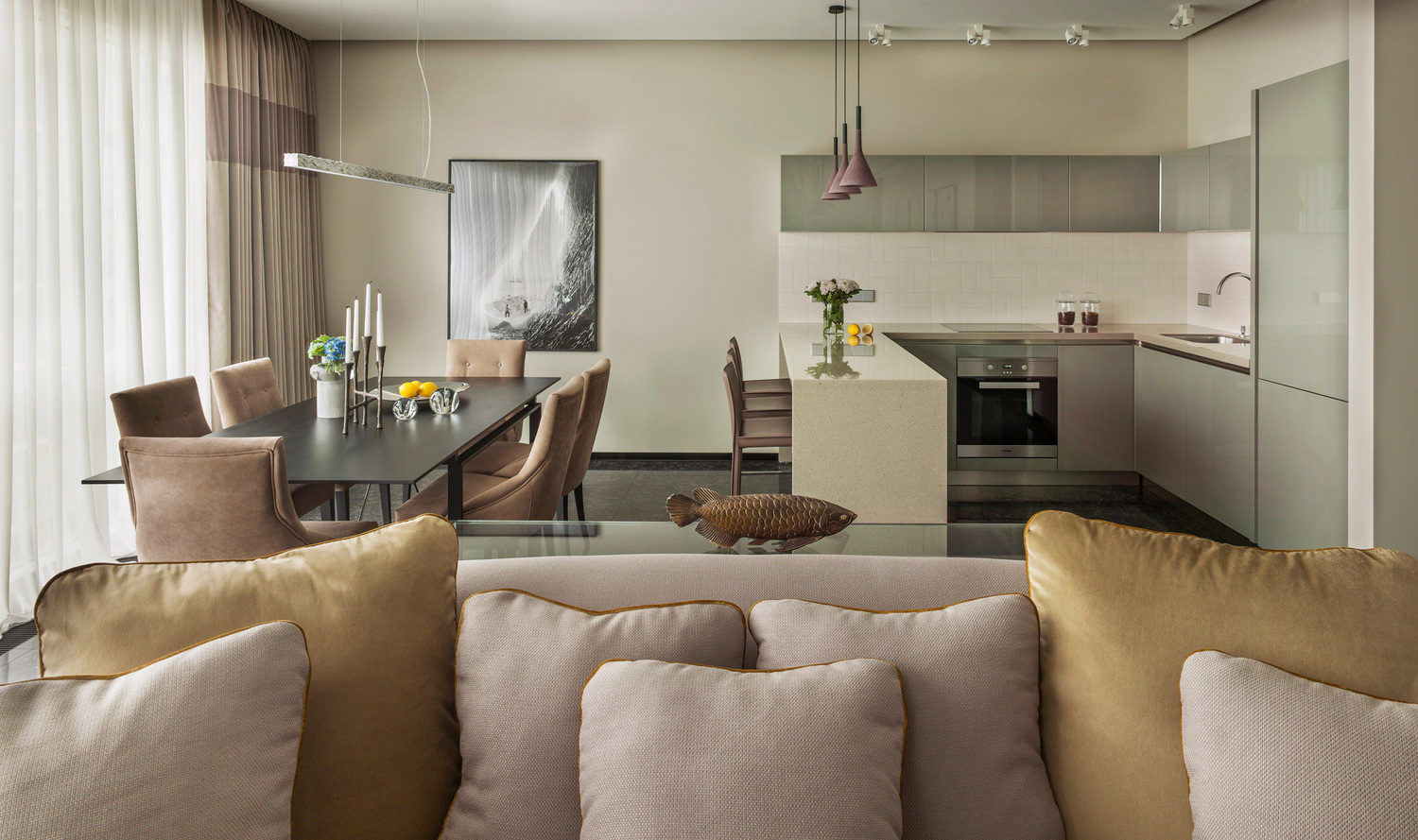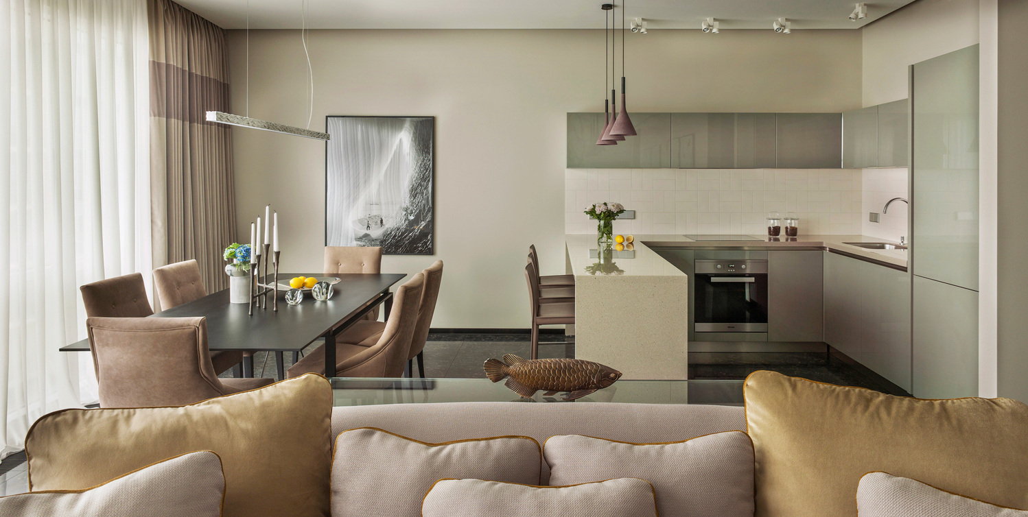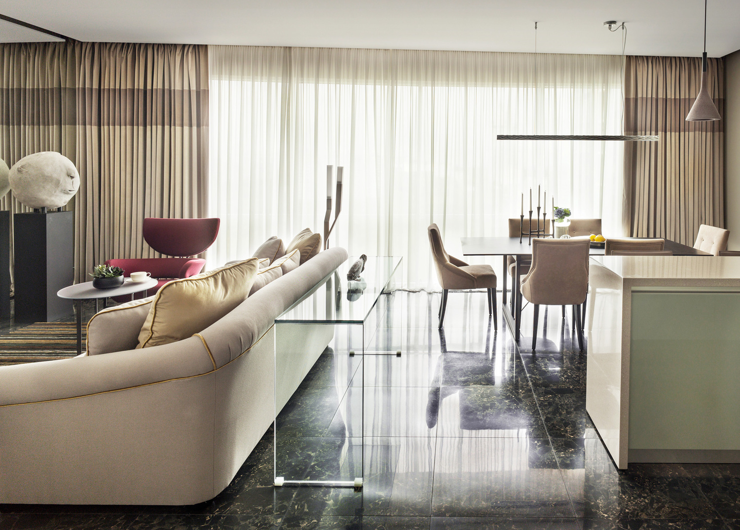 Большим преимуществом в этой квартиры было наличие панорамных окон и французских балконов. Биокамин и панно Sicis из перламутровой мозаики, которую дополняют зеркала и арт-объекты в виде голов, стали роскошным акцентом светлой, наполненной воздухом гостиной, совмещенной с обеденной зоной и кухней. Именно здесь мы решили внести в интерьер немного современного пафоса и гламура и предложили использовать натуральные цвета и оттенки. Мрамор, дерево благородных цветов, бетон, глянцевые поверхности фасадов кухни, метал в отделке мебели - все это украшает интерьер и делает его гармоничным и эффектным.