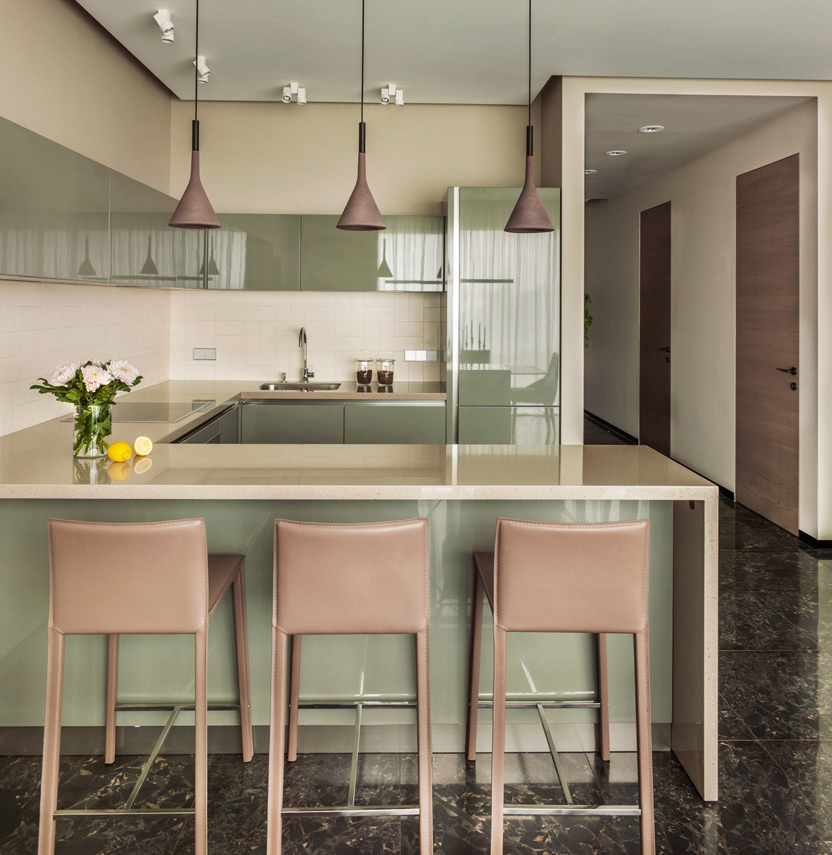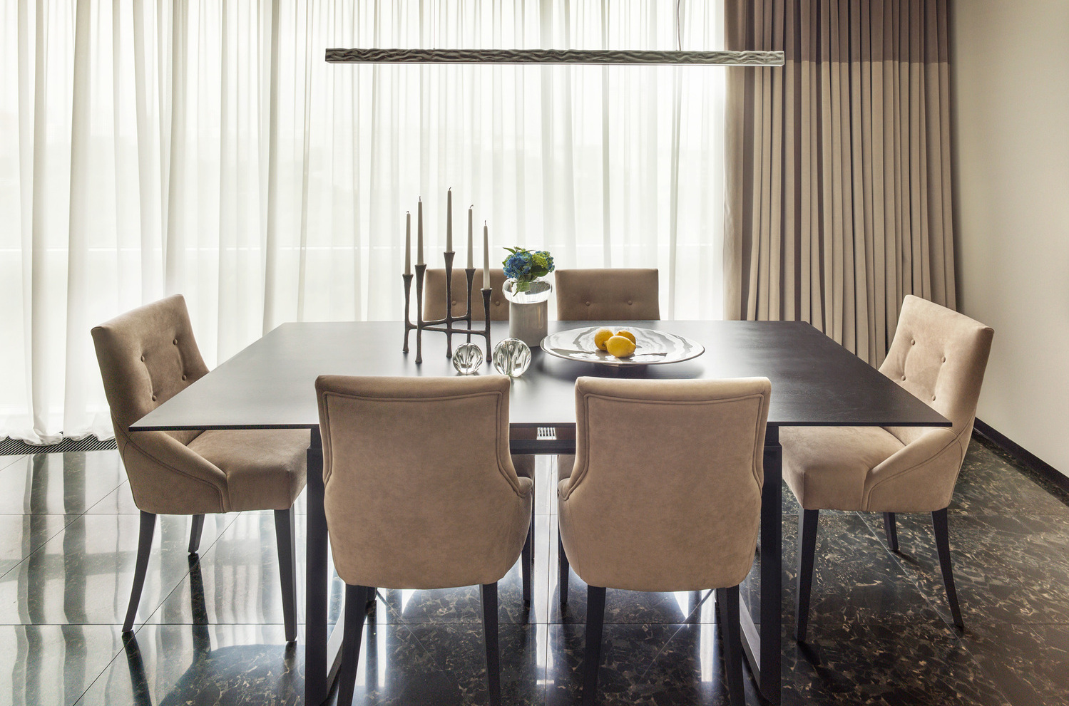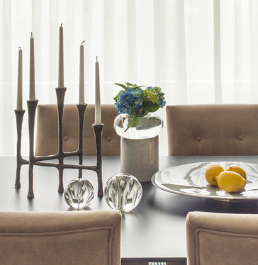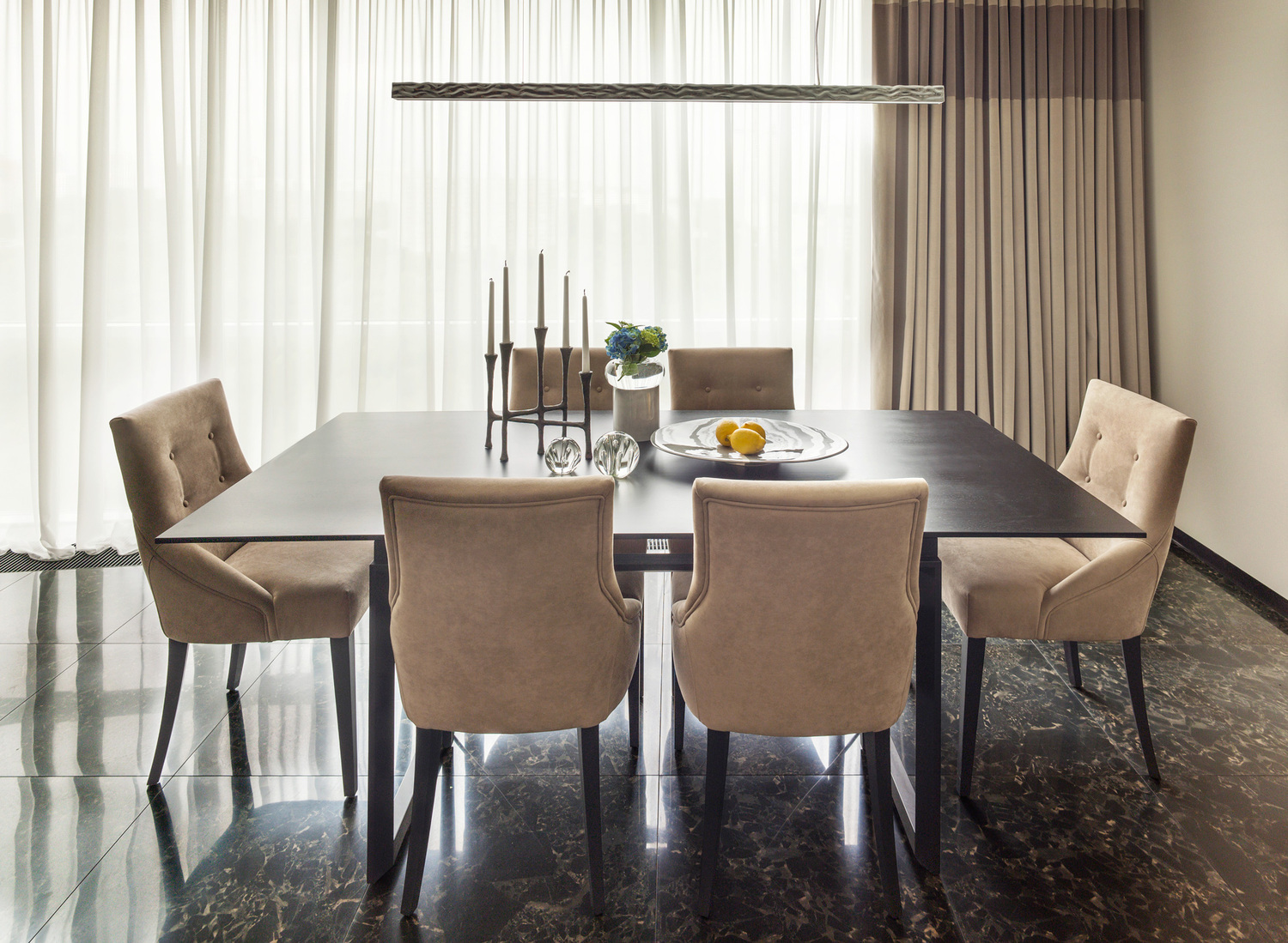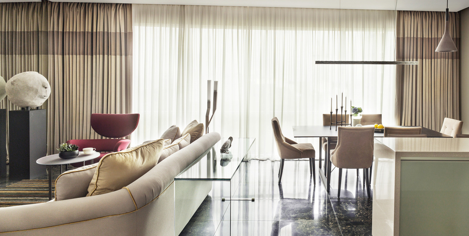 Большим преимуществом в этой квартиры было наличие панорамных окон и французских балконов. Биокамин и панно Sicis из перламутровой мозаики, которую дополняют зеркала и арт-объекты в виде голов, стали роскошным акцентом светлой, наполненной воздухом гостиной, совмещенной с обеденной зоной и кухней. Именно здесь мы решили внести в интерьер немного современного пафоса и гламура и предложили использовать натуральные цвета и оттенки. Мрамор, дерево благородных цветов, бетон, глянцевые поверхности фасадов кухни, метал в отделке мебели - все это украшает интерьер и делает его гармоничным и эффектным.