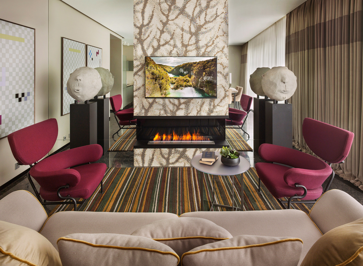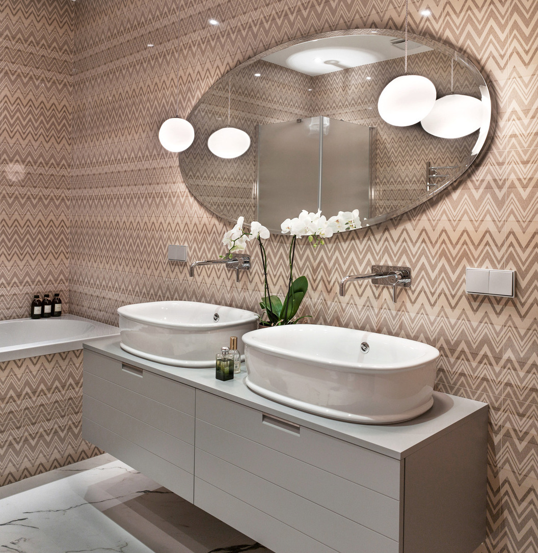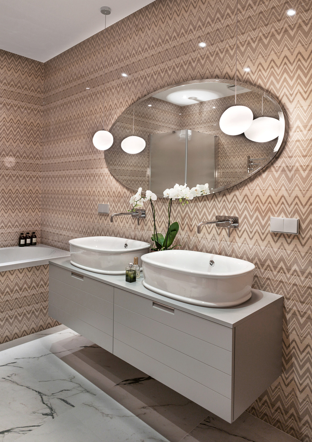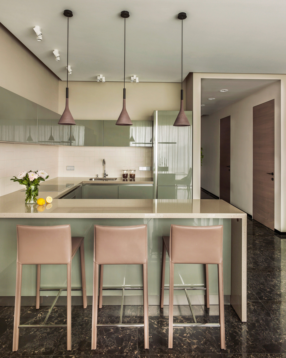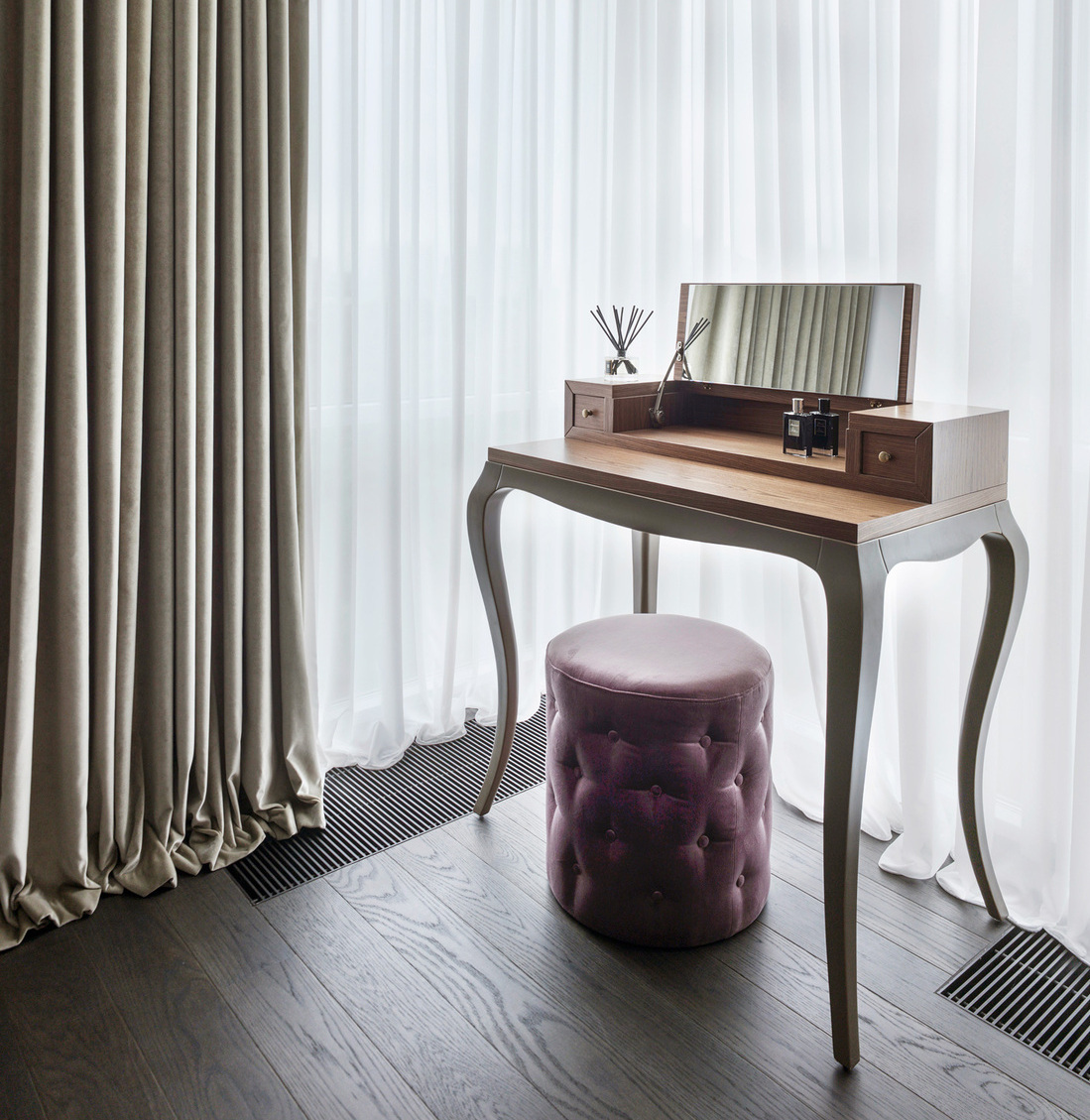 Большим преимуществом в этой квартиры было наличие панорамных окон и французских балконов. Биокамин и панно Sicis из перламутровой мозаики, которую дополняют зеркала и арт-объекты в виде голов, стали роскошным акцентом светлой, наполненной воздухом гостиной, совмещенной с обеденной зоной и кухней. Именно здесь мы решили внести в интерьер немного современного пафоса и гламура и предложили использовать натуральные цвета и оттенки. Мрамор, дерево благородных цветов, бетон, глянцевые поверхности фасадов кухни, метал в отделке мебели - все это украшает интерьер и делает его гармоничным и эффектным.