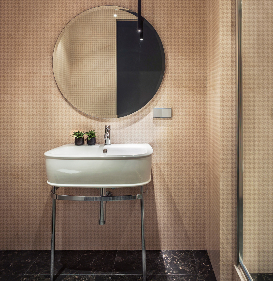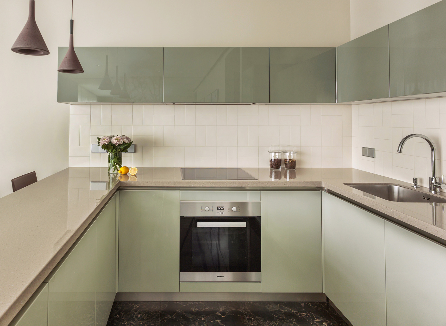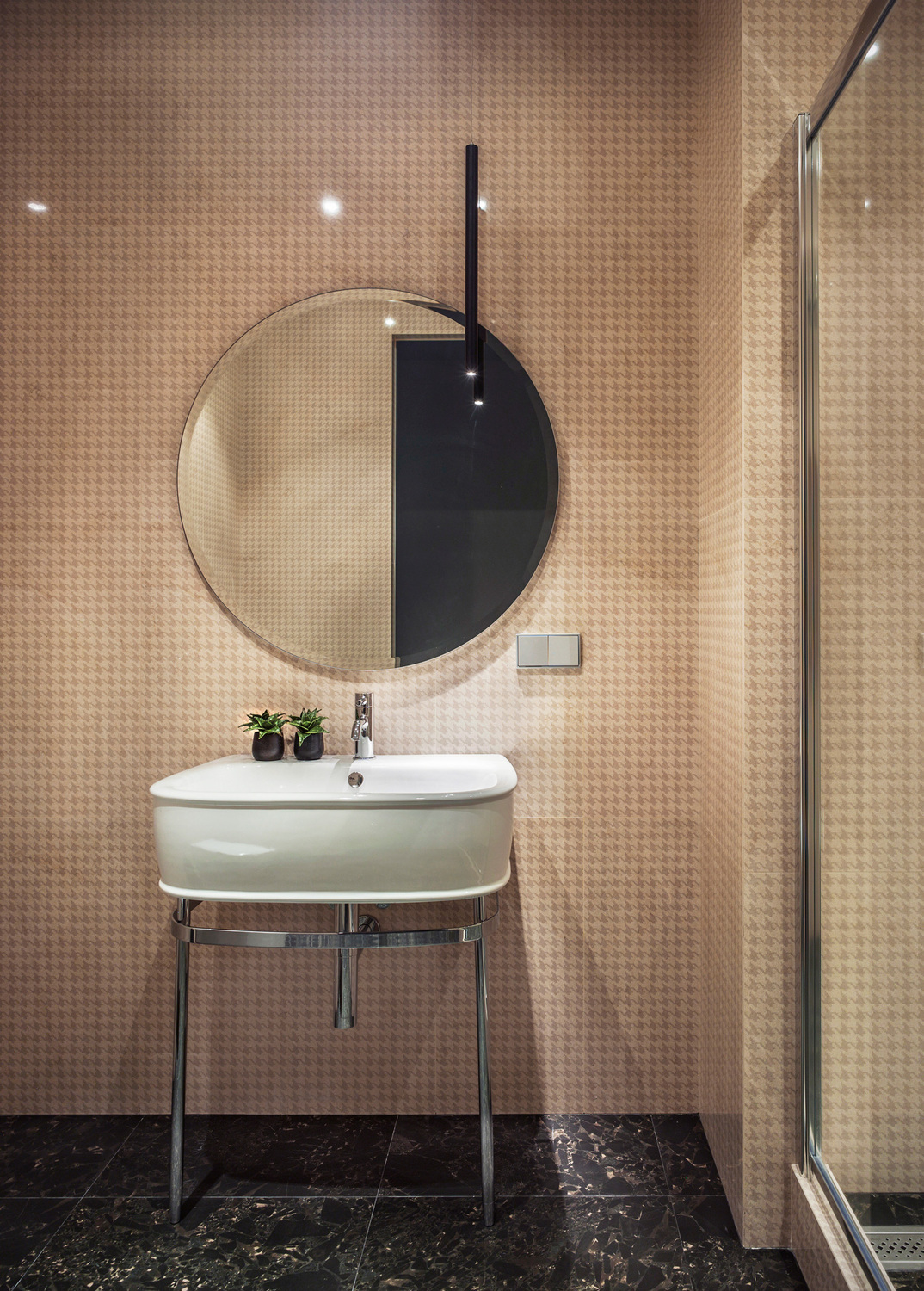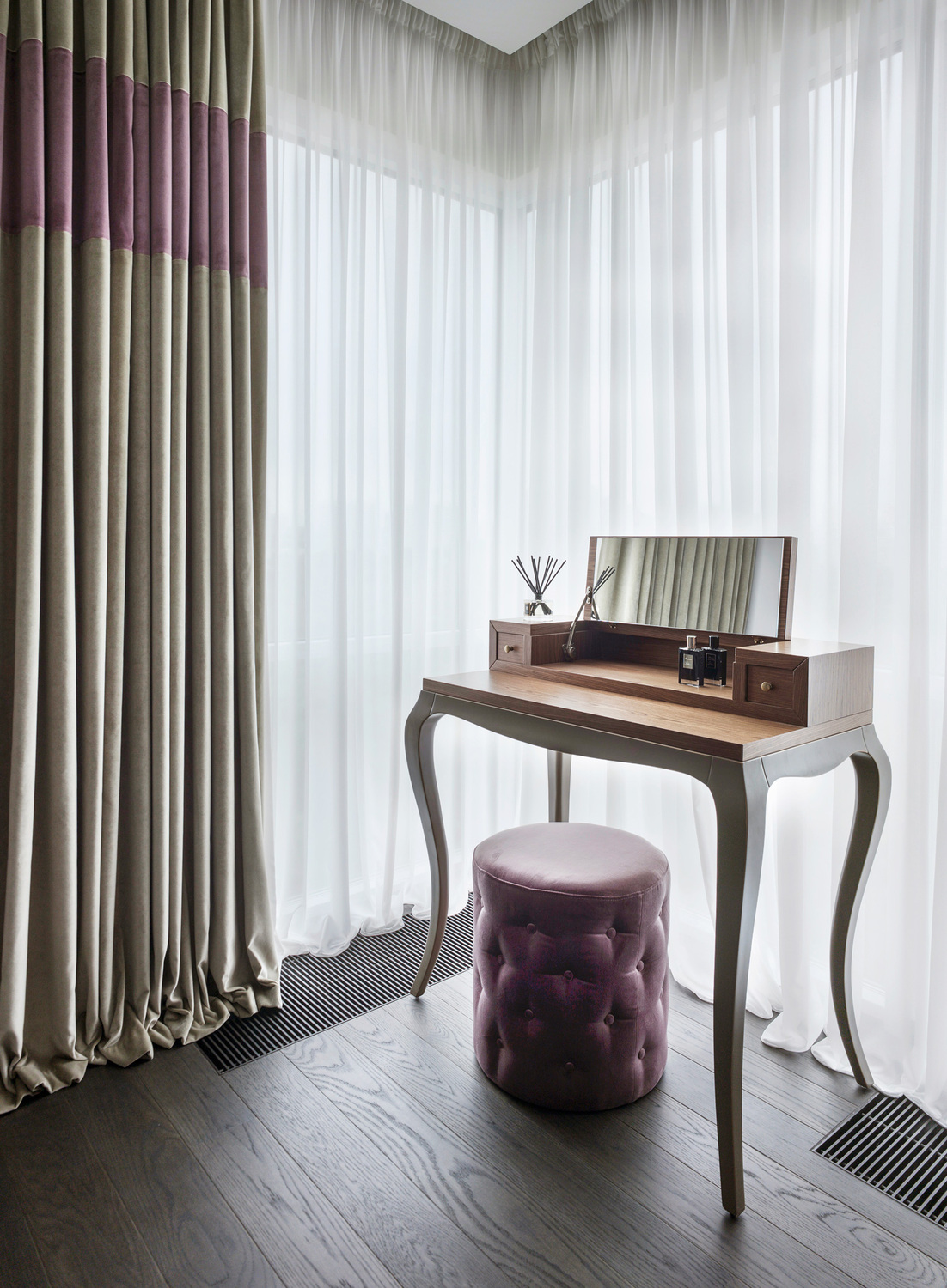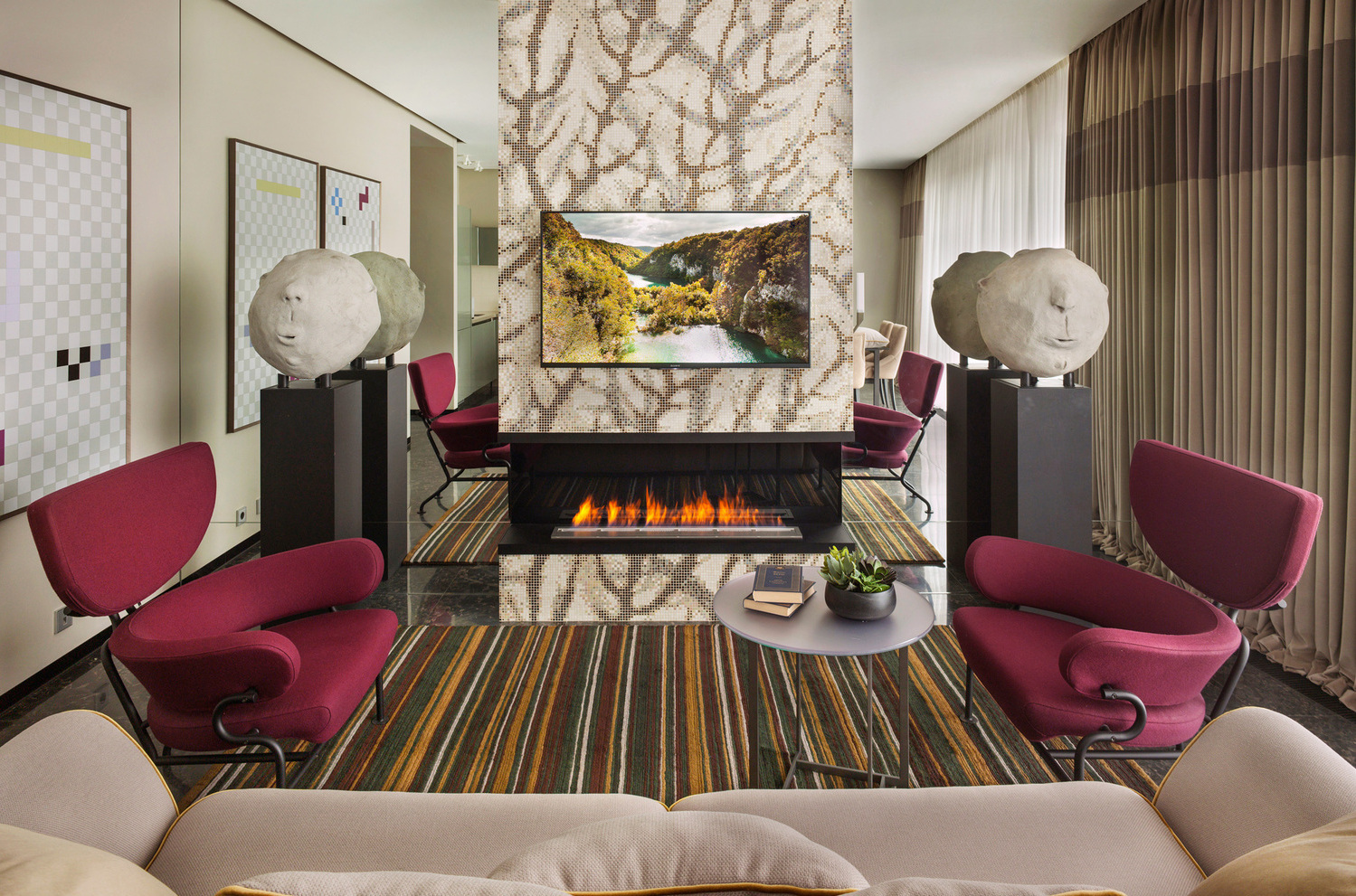 Большим преимуществом в этой квартиры было наличие панорамных окон и французских балконов. Биокамин и панно Sicis из перламутровой мозаики, которую дополняют зеркала и арт-объекты в виде голов, стали роскошным акцентом светлой, наполненной воздухом гостиной, совмещенной с обеденной зоной и кухней. Именно здесь мы решили внести в интерьер немного современного пафоса и гламура и предложили использовать натуральные цвета и оттенки. Мрамор, дерево благородных цветов, бетон, глянцевые поверхности фасадов кухни, метал в отделке мебели - все это украшает интерьер и делает его гармоничным и эффектным.