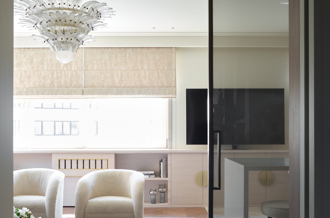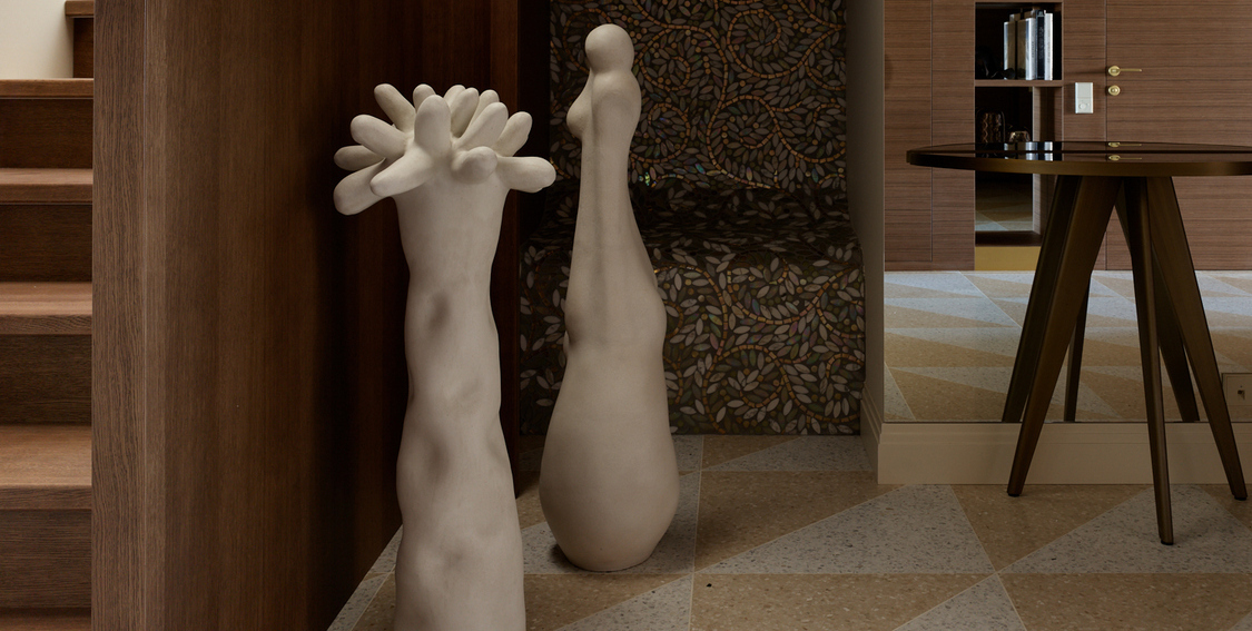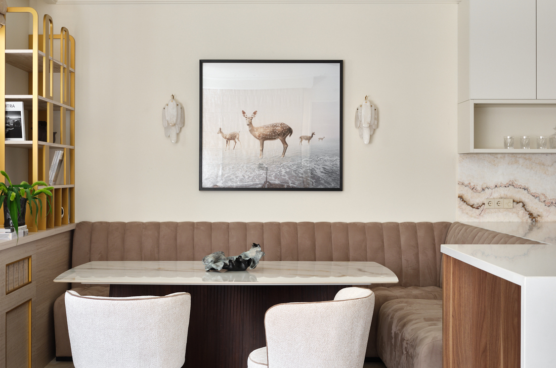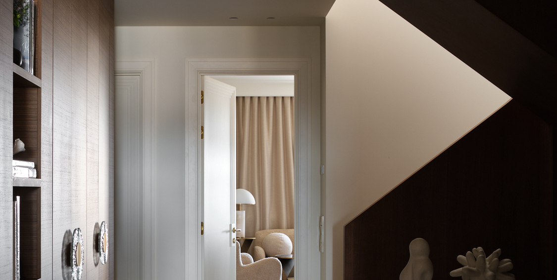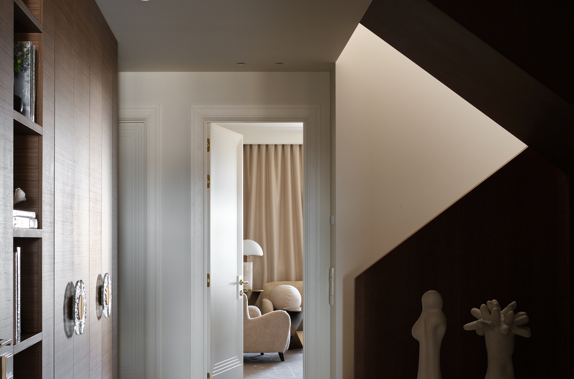 Двухуровневая кваритра в новостройке не имела отделки, нам пришлось работать со сложным пространством с минимальным количеством естественного света и сложной геоментией потолка на втором уровне. После перепланировки пространсто приобрело уникальность, обеспечивая четкое разделение зон отдыха и быта. Цвет стен мы предложили в квартире единый - кремовый, он создает атмосферу простора и легкости каждому помещению. Шелковые обои, кленовый шпон, гипсовые элементы на потолке и стенах, стильные акценты придают интерьеру изысканный и благородный характер. Венчает это элитное жилье обширная терраса, предоставляющая возможность наслаждаться свежим воздухом и панорамным видом на столицу.