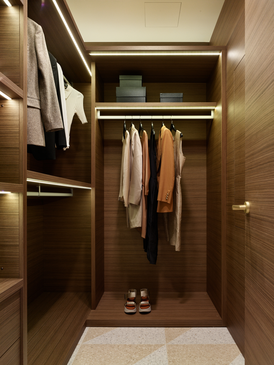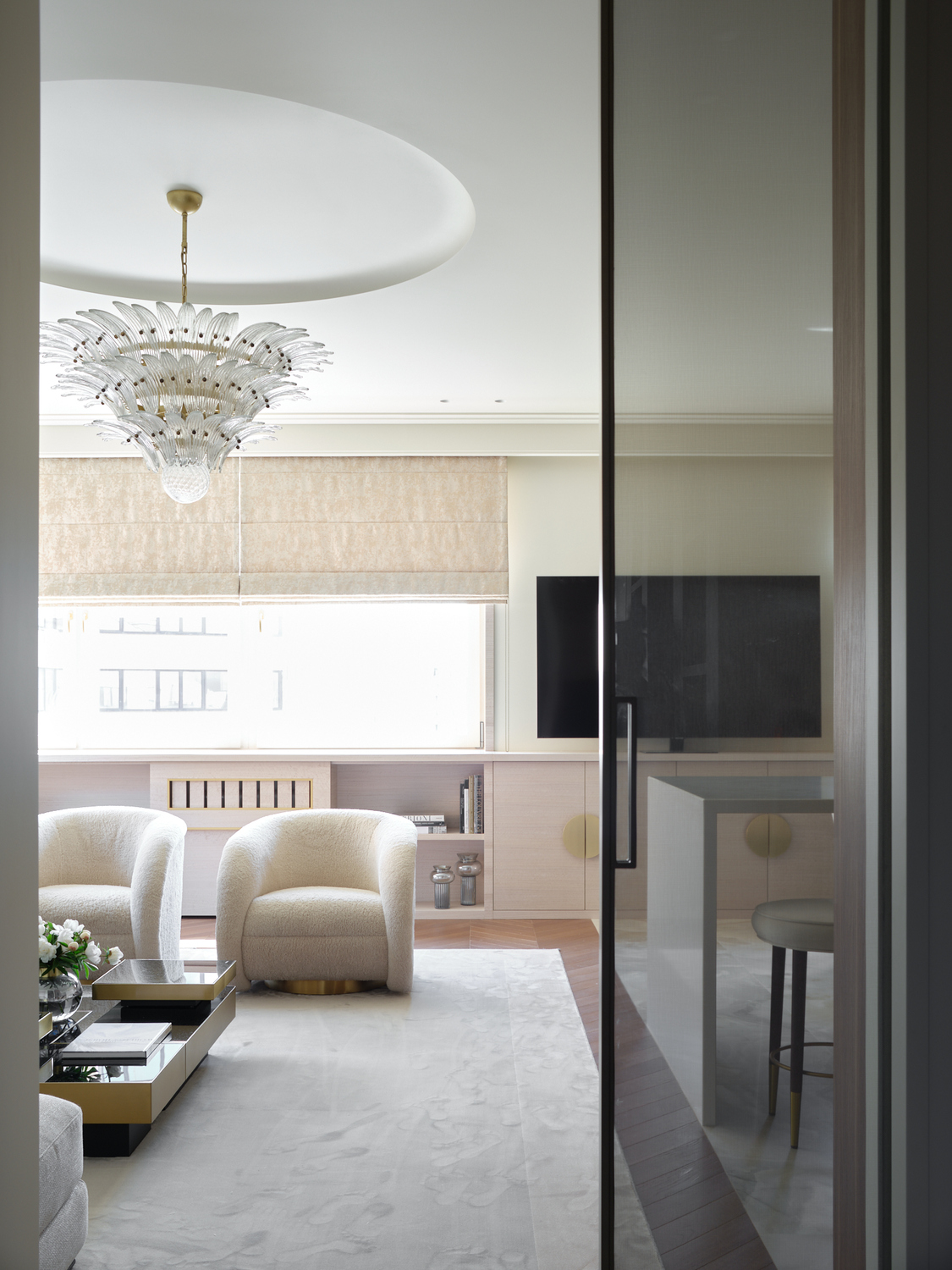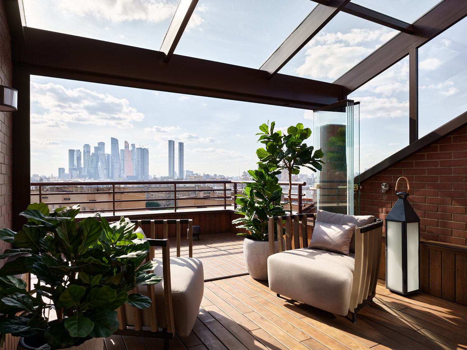 Двухуровневая кваритра в новостройке не имела отделки, нам пришлось работать со сложным пространством с минимальным количеством естественного света и сложной геоментией потолка на втором уровне. После перепланировки пространсто приобрело уникальность, обеспечивая четкое разделение зон отдыха и быта. Цвет стен мы предложили в квартире единый - кремовый, он создает атмосферу простора и легкости каждому помещению. Шелковые обои, кленовый шпон, гипсовые элементы на потолке и стенах, стильные акценты придают интерьеру изысканный и благородный характер. Венчает это элитное жилье обширная терраса, предоставляющая возможность наслаждаться свежим воздухом и панорамным видом на столицу.